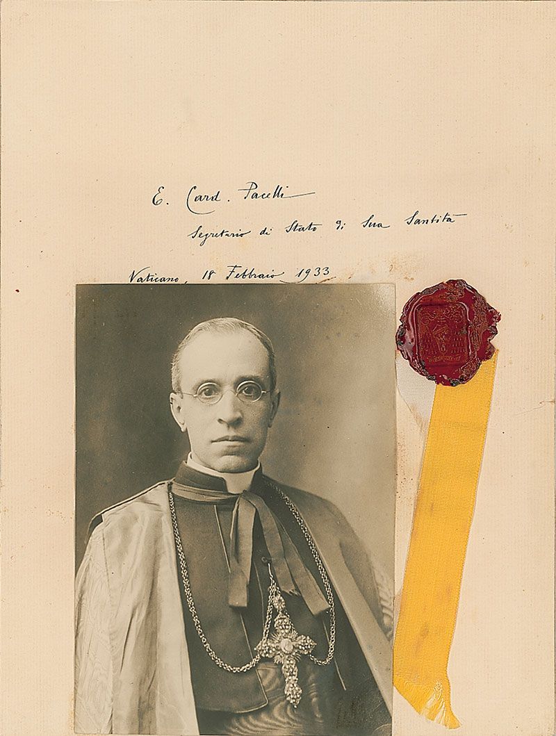 Pope, born Eugenio Maria Giuseppe Giovanni Pacelli (1876–1958), who reigned from 1939 until his death. Ink signature, “E. Card Pacelli, Segretario di Stato di Sera Santita, Vaticano, 18 Febbraio 1933,” on an off-white 7.75 x 10 sheet, with a matte-finish