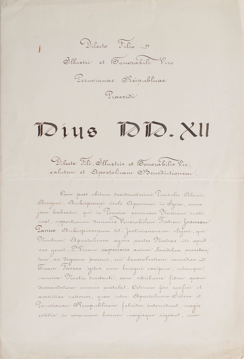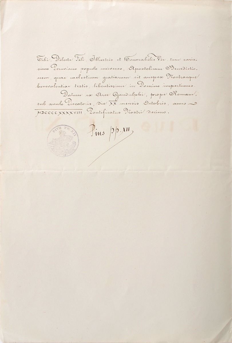 Manuscript DS in Latin, signed “Pius P. P. XII,” one page both sides, 10.5 x 15.5, October 20, 1948. Untranslated letter to the president of Peru concerning an ambassador. In fine condition. An unusual diplomatic example boasting a crisp, bold signature.