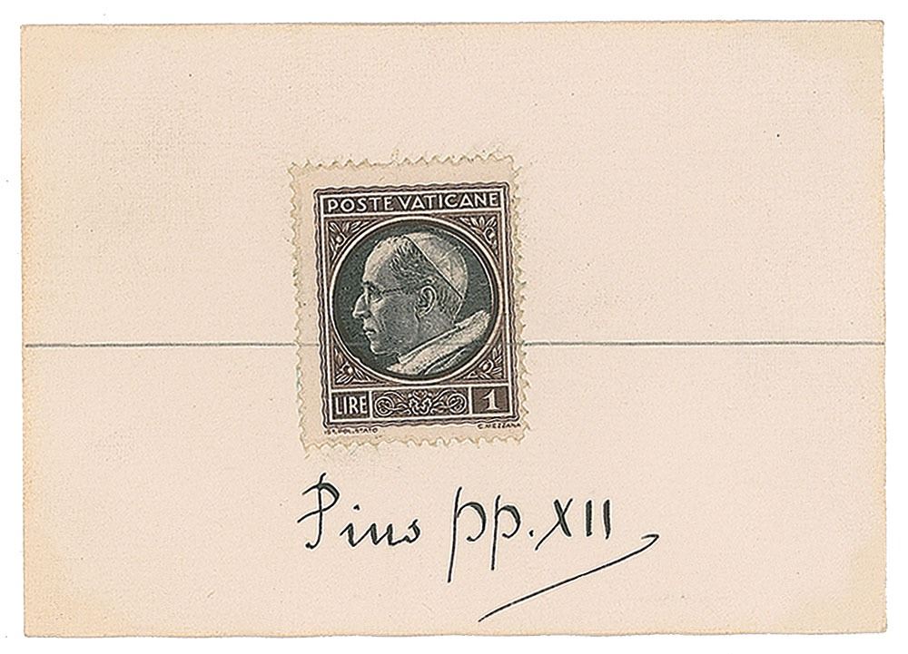 Bold vintage fountain pen signature, "Pius PP XII,” on an off-white 3.5 x 2.5 card bearing an affixed postage stamp from the Vatican. In fine condition.