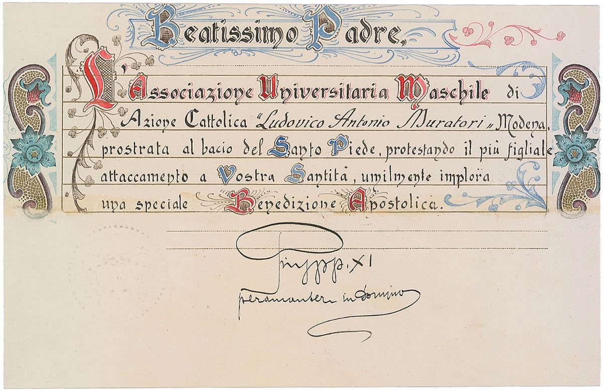 Pope (1857–1939), born Ambrogio Damiano Achille Ratti, who ascended the papal throne in 1922 and issued encyclicals condemning communism, fascism, and racism. Colorful hand-calligraphed and illuminated apostolic blessing, trimmed to a size of 11.5 x 7.25, nicely signed at the conclusion, “Pius pp. XI.” Blindstamped with the papal seal in the lower left. In fine condition, with a central horizontal band of toning and trivial surface loss.