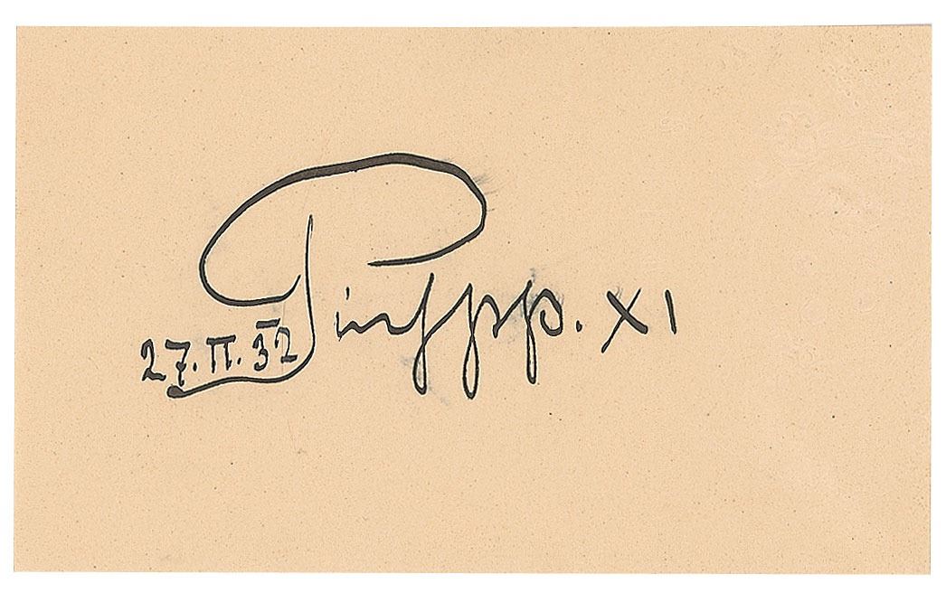 Pope, born Ambrogio Damiano Achille Ratti (1857–1939), who reigned from 1922 until his death and issued encyclicals condemning communism, fascism, and racism. Bold fountain pen signature, "Pius PP XI, 27. II. 32,” on an off-white 3.75 x 2.25 embossed card. In fine condition.