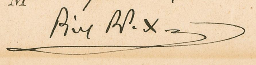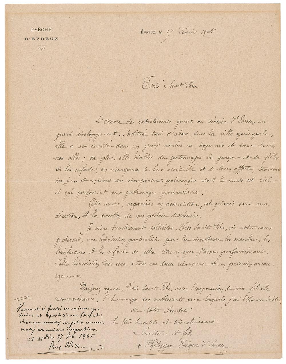 Born Giuseppe Melchiorre Sarto in 1835, Pius X served as pope from 1903 until his death in 1914. Known for his conservative, anti-modernist philosophies, he became, in 1954, the first pope to be elevated to sainthood since Pius V in 1712. Handwritten endorsement, in Latin, signed “Pius PP X,” dated in his hand “27 Feb. 1905,” at the bottom of an ALS, in French, dated February 17, 1905, signed “Philippe Eveche d’Evreux,” on an 8.5 x 11 sheet. Pius pens a four line endorsement in the lower left corner, signing underneath. Central horizontal and vertical fold, uniform toning, a bit heavier at edges, some small edge tears, and a few light creases, otherwise fine condition. An interesting and less-seen format for any Pope.