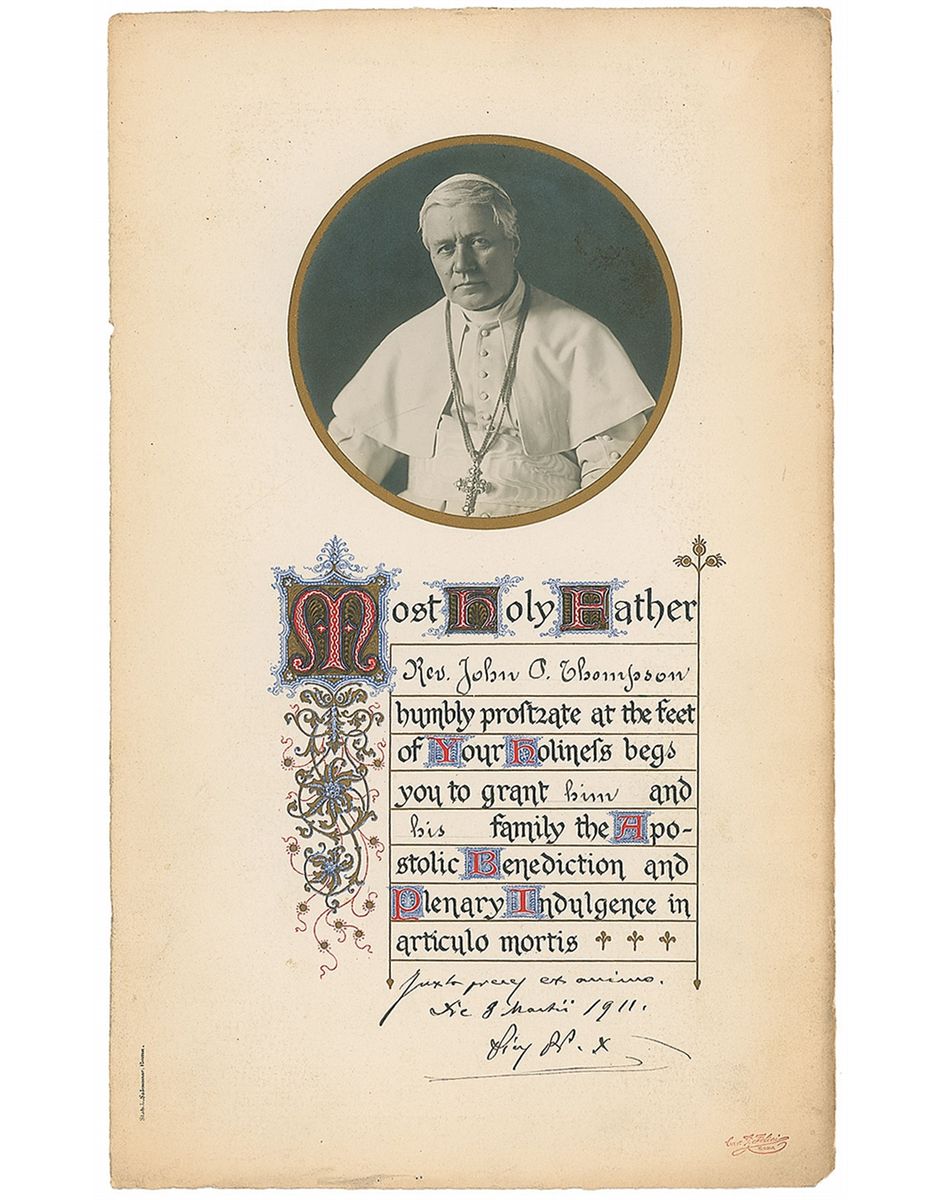 Born Giuseppe Melchiorre Sarto in 1835, Pius X served as pope from 1903 until his death in 1914. Known for his conservative, anti-modernist philosophies, he became, in 1954, the first pope to be elevated to sainthood since Pius V in 1712. Apostolic blessing, signed “Pius PP. x,” 8 x 13.25, with a 4.25? diameter portrait of Pius at the top, issued to Reverend John A. Thompson, signed at the conclusion by the Pope, dated March 3, 1911, with Pius adding one line in Latin above his signature granting the blessing. In fine condition, with a bit of scattered light toning and soiling to edges, and a staple hole to bottom edge.