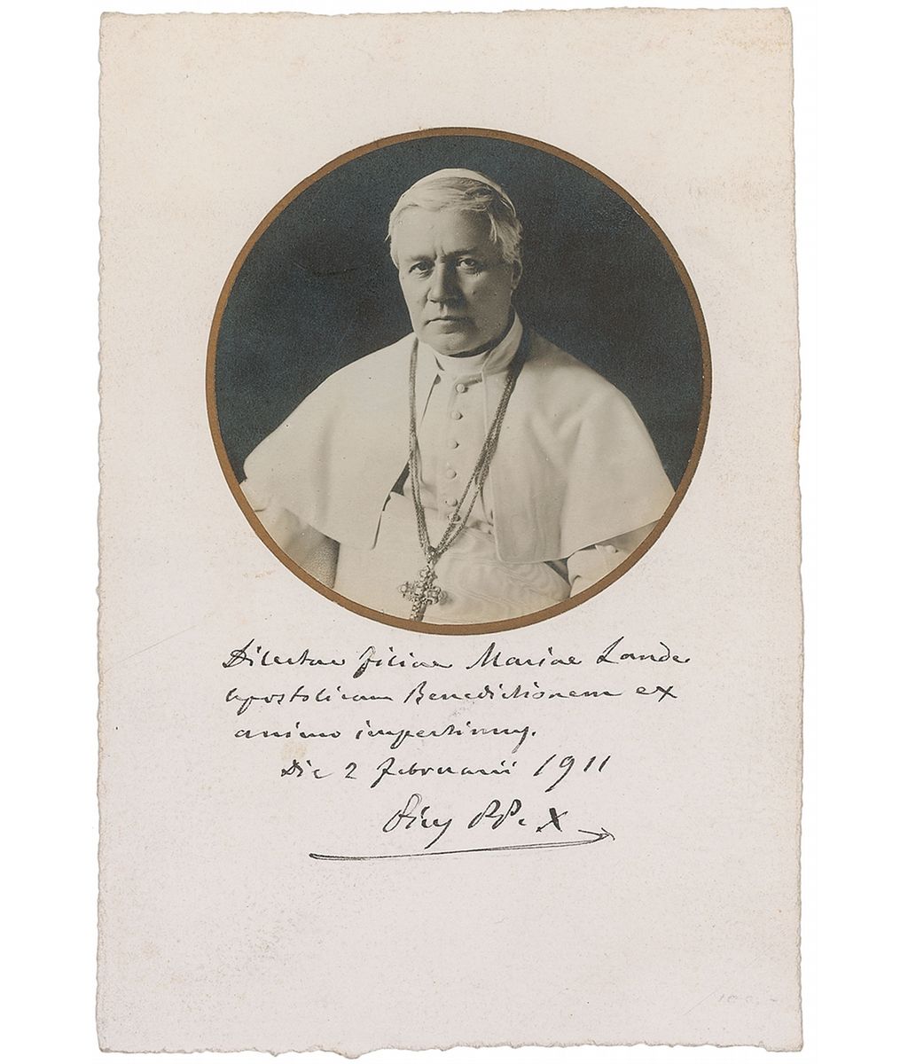 Born Giuseppe Melchiorre Sarto in 1835, Pius X served as pope from 1903 until his death in 1914. Known for his conservative, anti-modernist philosophies, he became, in 1954, the first pope to be elevated to sainthood since Pius V in 1712. Three-inch diameter circular photo by Felicia of Rome, affixed to its original 4.5 x 6.5 mount, inscribed on the mount in black ink by the Pope in Latin, signed “Pius PP. X,” and dated February 2, 1911. In fine condition.