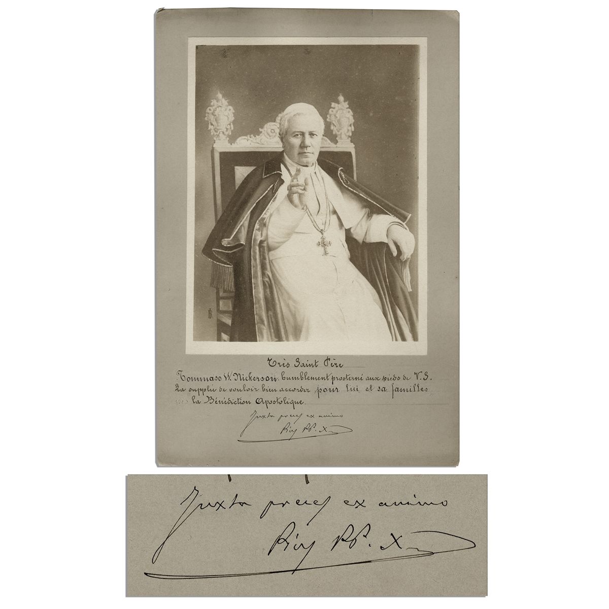 Pope Saint Pius X photo display signed. Vatican portrait of the Pope seated on the Papal throne is mounted to a mat bearing his autograph inscription in Latin and his signature, ''Pius PP. X''. Above the signature is a sentiment written in French by a Thomas W. Nickerson requesting blessings by the Pope for his family and himself. Matte photo print itself measures 7'' x 9''. Signed mat measures 9'' x 13.25''. Pencil notation to verso, else near fine.