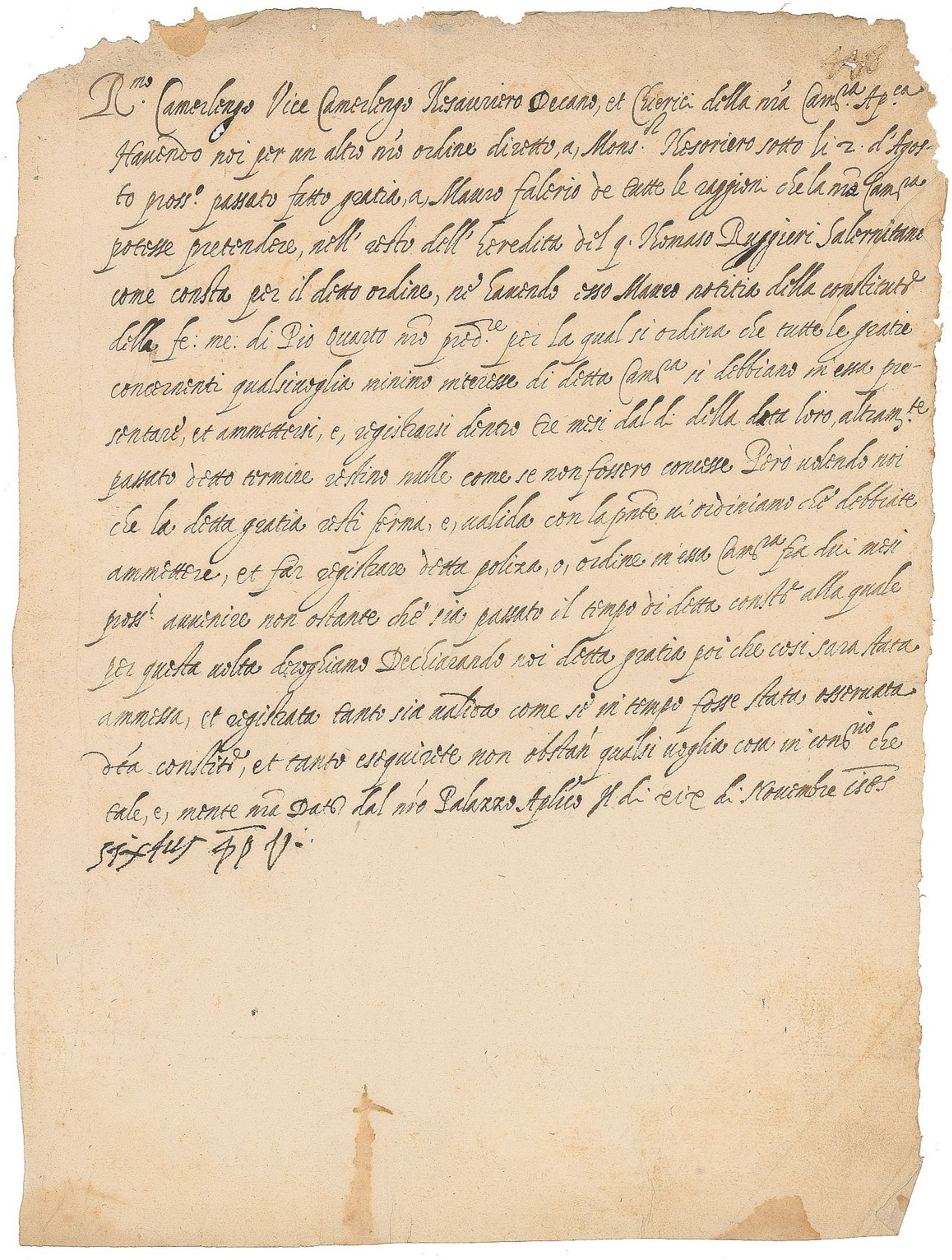 Born Felice Peretti di Montalto (1521–1590) who served as Pope from 1585 to 1590. He was responsible for reforming the central administration of the church, instituting financial reforms to restore solvency to the papal states, completing Saint Peter's dome, and rebuilding the Vatican. Untranslated LS in Italian, signed “Sixtus pp V,” one page, 8 x 10.75, November 1585. In very good to fine condition, with rough edges, staining to the lower blank area, and small areas of ink erosion (nor to the signature).