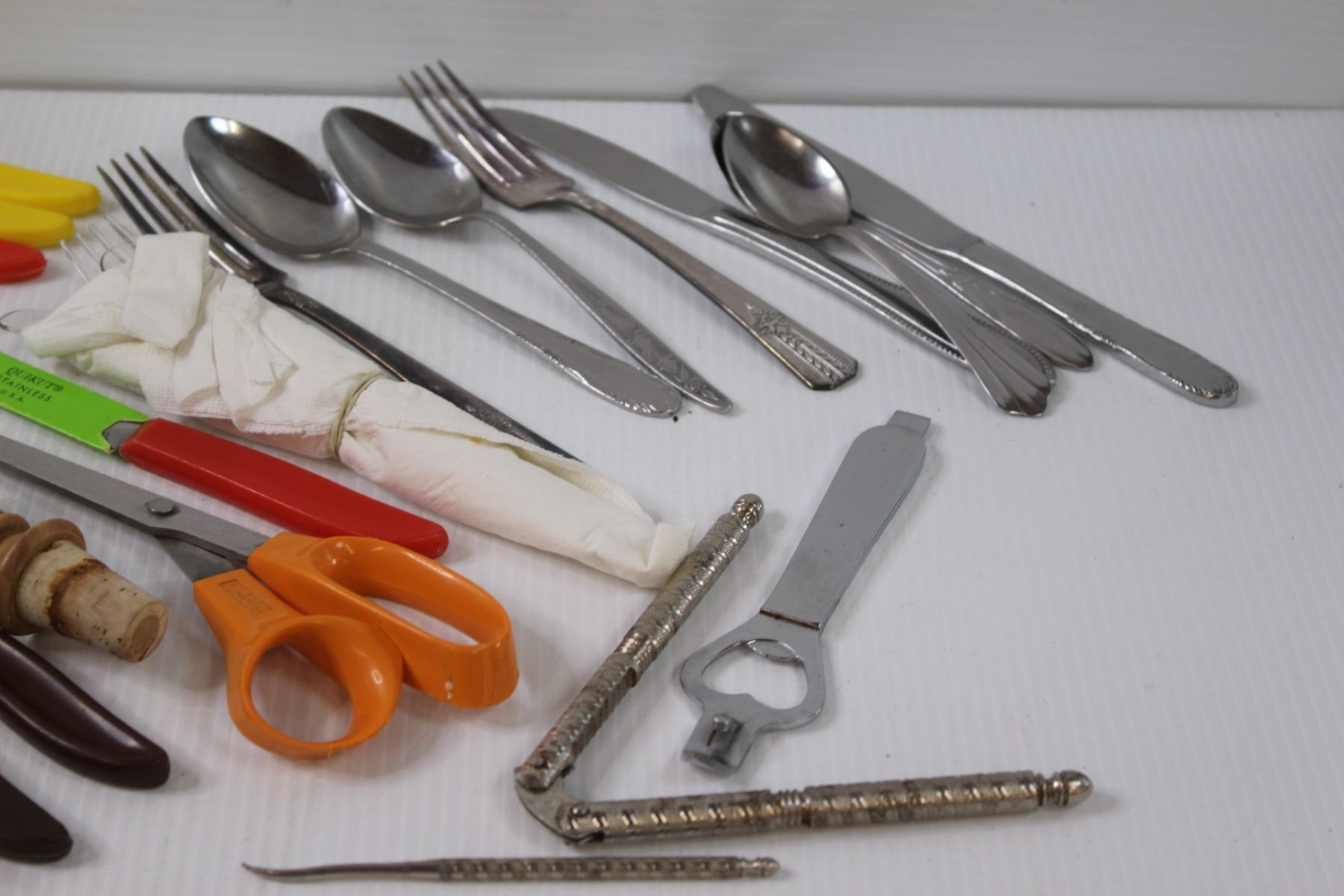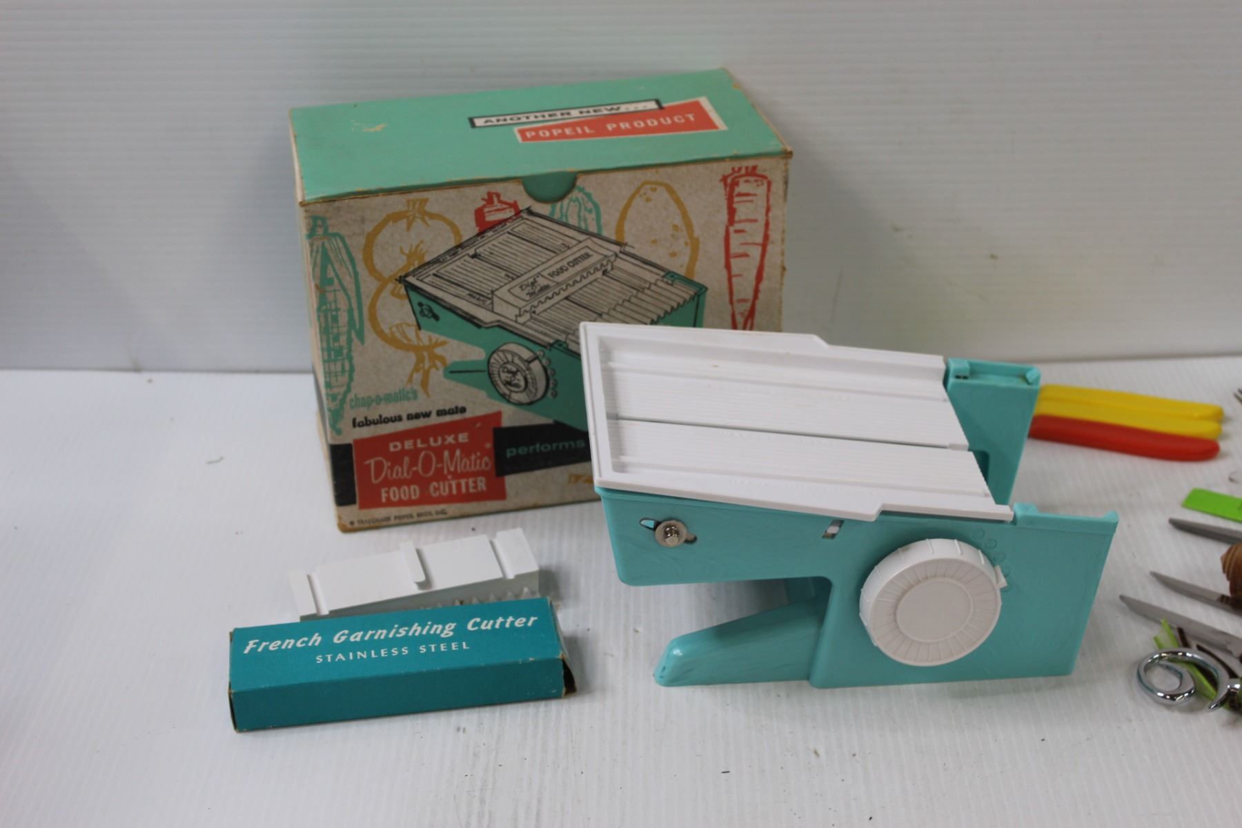 Popeil Deluxe Dial-o-Matic Food Cutter & Various Parring Knives, Nut Cracker, Cork Stoppers, Misc.