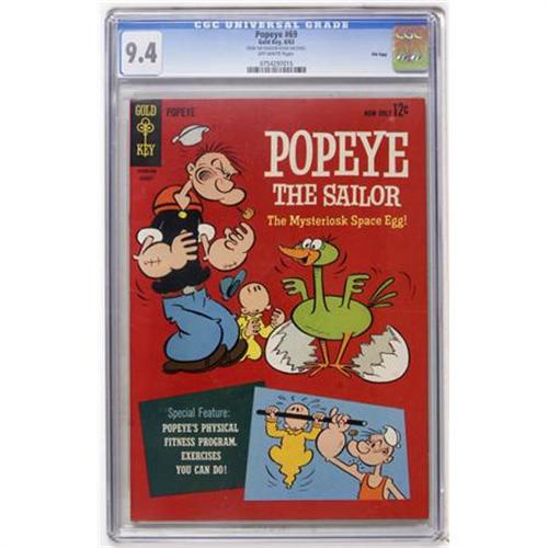 <B>Popeye #69 File Copy (Gold Key, 1963) CGC NM 9.4 Off-white pages.</B></I> CGC notes, "From the Random House Archives." Overstreet 2007 NM- 9.2 value = $48. CGC census 9/07: 3 in 9.4, none higher.<BR><BR><b>Shipping:</b> Comics - Slabbed (certified) (<a target="_blank" href="http://www.heritageauctions.com/common/shipping.php">view shipping information</a>)