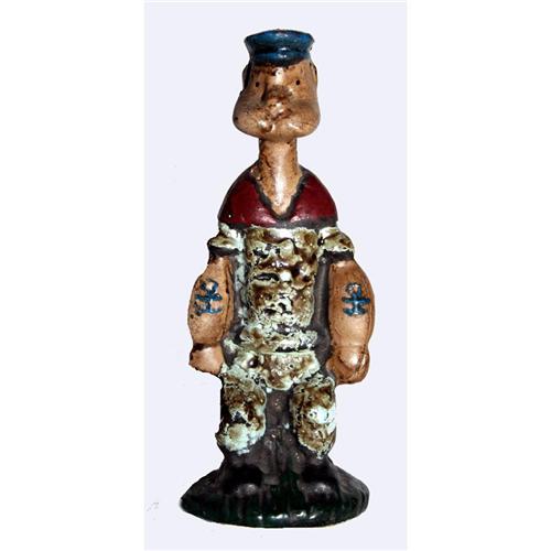 Popeye figure in cast iron measures approximately 4.25" tall.  Paint appears to be original and in good condition right down to the tattoos on his forearms.  Heavy.