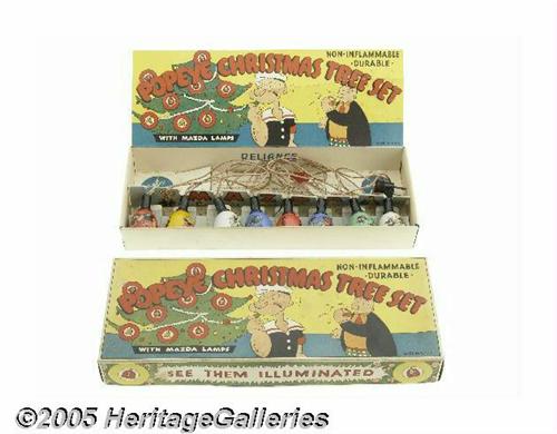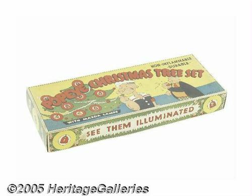 <B>Popeye Christmas Tree Set (Reliance, 1936).</B></I> Produced by Reliance during 1935 and 1936, these Popeye Christmas lights are a real prize for any collection. Housed is an attractive box featuring Popeye and Wimpy (who even at Christmastime finds time for a hamburger!), all lights and the foldout display picture are also included. The box is in fine shape with no torn corners, virtually no color fading, and a minimum of wear. The images are nice and sharp. As with so many items in the Larry Jacobs Collection, this is an exceptional piece. <I>From the Larry Jacobs Collection.</B></I>