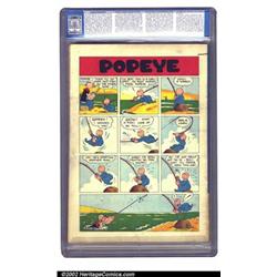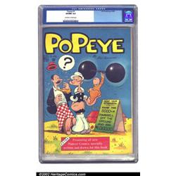 Popeye Comics #1 (Dell, 1948) CGC VF/NM 9.0 Off-white to white pages. Here's a neat first issue with a classic image of Popeye. After all of the Four Color issues, Dell finally decided to go ahead and give Popeye his own, self-titled book. Overstreet 2002 NM 9.4 value = $360. Important notice: We expect to be auctioning lots at the rate of 200-250 per hour. Sometimes eBay Premier live bid software cannot keep up with that pace, so we strongly recommend that you place a realistic proxy bid now as insurance to avoid disappointment. Also please note that all Heritage/CAA lots purchased through eBay Premier carry a 20% Buyer's Premium. Please make sure you read the Terms and Conditions.