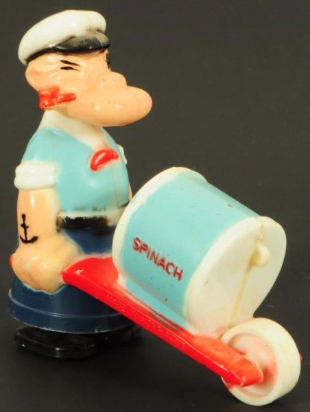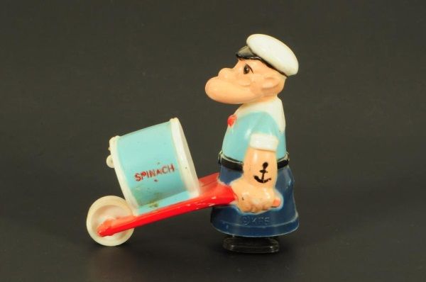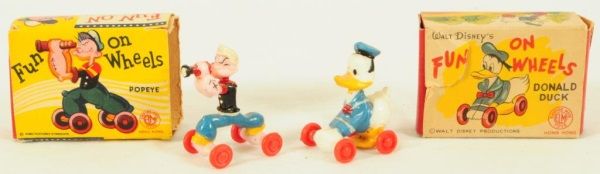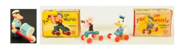 Popeye Walking Spinach Wheel Barrow Plastic Toy (Marked "Made in Hong Kong" under left foot, 3" x 3" x 2"; Empire Donald Duck & Popeye Fun On Wheels Toys (Miniature Popeye and Donald Duck plastic toys, each in their original box. Each figure measures 1-1/2" H.