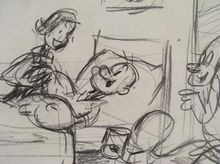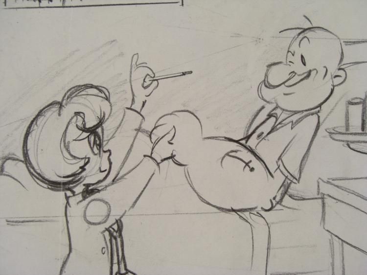 Here is both a sketch and a finished drawing of Popeye in the hospital. The beloved sailor is being cared for by Nurse Olive Oyl, and a young nurse in training. And, since it's Halloween, Casper the Ghost and friends come by to visit with a gift of spinach. The drawing is signed by its animator, Myron Waldman. The late Mr. Waldman was a head of Max Fleischer Studios in the early days when Popeye made his first appearance, and he's known as a pioneer in animation. * Animator: Myron WaldmanSigned: In pencil, lower right Medium: Black pencil on animator's paperSheet size: 10 1/4 x 12 1/4 inchesDetails: Numbers at the bottom rightCondition: Excellent condition, with crease marks at the upper left and lower right