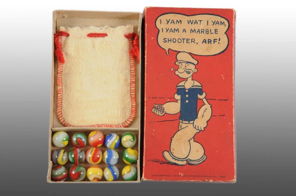 Bottom of box has been replaced but bag and marbles are original. Condition (Near Mint). Size Box: 3 - 1/2" x 6 - 3/4".