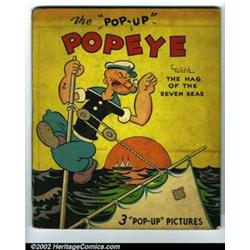 Popeye Pop-Up Book With the Hag of the Seven Seas Hardcover (Pleasure Books, 1935). Almost never offered for sale, this Popeye Pop-Up book is in excellent condition. The illustrations are from the Thimble Theatre daily strips drawn by E.C. Segar. The pop-ups are in beautiful color and are on the front, back and center of the book. All 3 pop-ups work and are still fresh and stiff. The only major defects are one small chip off the back cover and a small amount of stress on the spine. This rare book, not currently listed in the Overstreet Price Guide, would be an asset to any Popeye collection. Condition: FN- Off-White pages. Important notice: We expect to be auctioning lots at the rate of 200-250 per hour. Sometimes eBay Premier live bid software cannot keep up with that pace, so we strongly recommend that you place a realistic proxy bid now as insurance to avoid disappointment. Also please note that all Heritage/CAA lots purchased through eBay Premier carry a 20% Buyer's Premium.