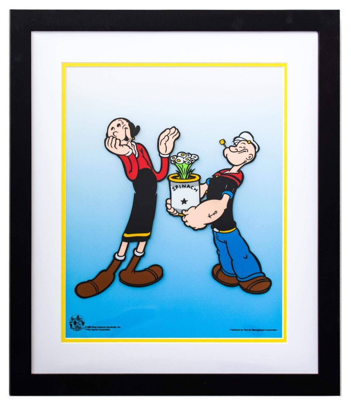 Artist: Popeye. Medium: Sericel. Title: Popeye Spinach. Size (Unframed): 16" x 13". Size (Framed): 23" x 20". Certificate of Authenticity: Is included. Additional: Perfect for the casual fan and the avid collector, this image of Popeye offering Olive Oyl a bouquet of flowers in a spinach can captures the essence of these characters! "Popeye Spinach" is a deluxe limited edition Popeye sericel with a high quality giclee background! Includes Certificate of Authenticity!. Reference# 11522.