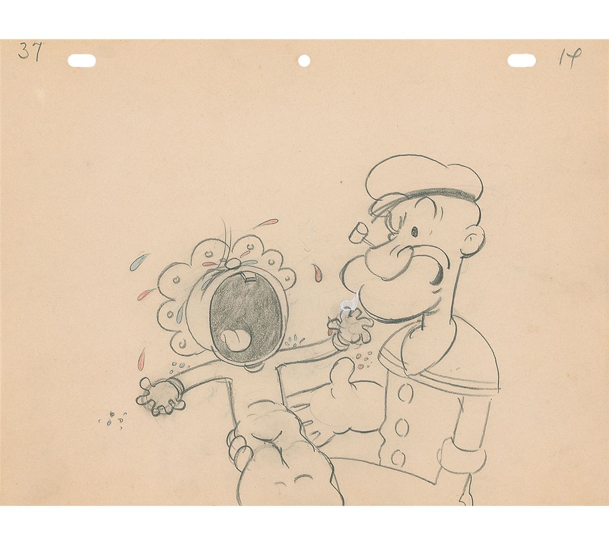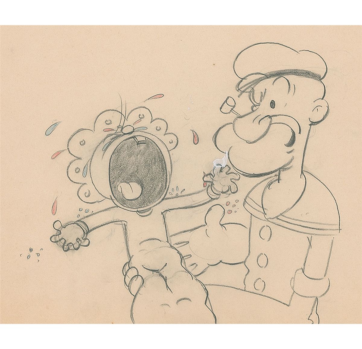(Fleischer Studios, 1934) Original production drawing featuring Popeye and Billy Boop from Sock-a-Bye, Baby, the sixth Popeye cartoon that Fleischer released. Accomplished in graphite and colored pencil on untrimmed 11 x 8.5 animation paper. Image measures 7 x 6.25. In fine condition. Billy Boop was the younger brother of Betty Boop, and makes a cameo appearance in Sock-a-Bye, Baby, with Popeye’s own son, Swee’Pea, not being introduced to animation until two years later.