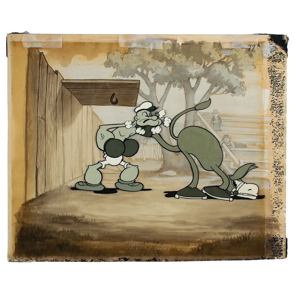 (Fleischer Studios, 1934) Original production cel and background featuring Popeye squaring off against a donkey from Let's You and Him Fight, showing Popeye wearing boxing gloves and getting kicked in the face. The cel is placed on a hand-painted production background from the same film. Image measures 8 x 4, with overall dimensions of 11.5 x 9.25. The cel has been professionally restored. Fleischer released Let's You and Him Fight as a theatrical cartoon short, and it was the first cartoon to have the song 'Stars and Stripes Forever' playing during Popeye's spinach fight. This wonderful Popeye setup featuring the cel and background from the same cartoon is one of just ten known to exist at present, and shows a very appealing action scene from an early release of the iconic cartoon.