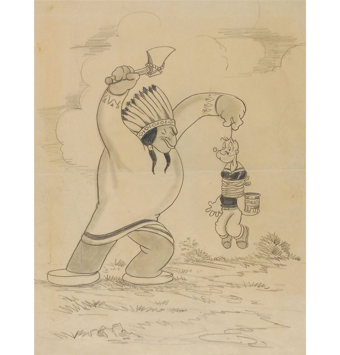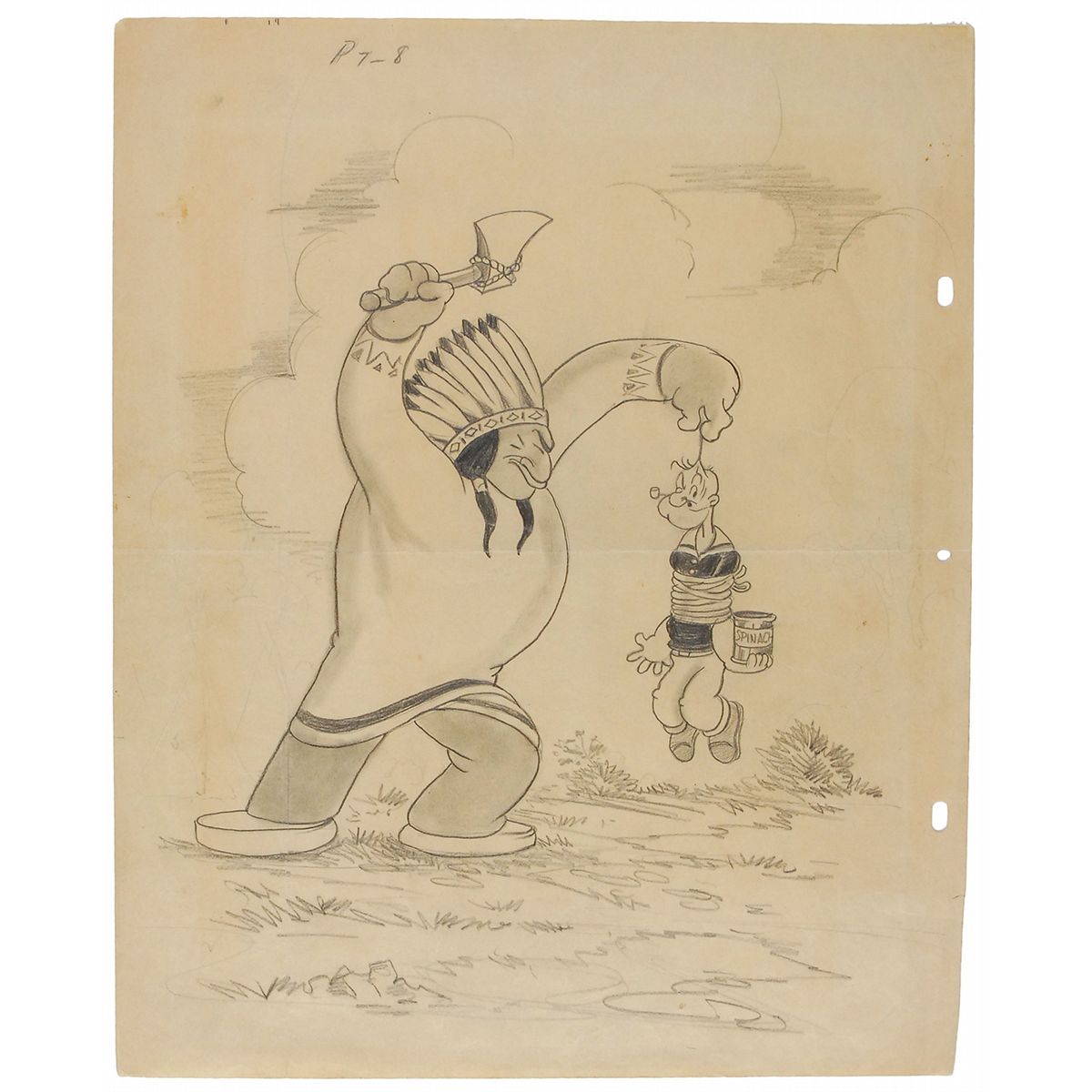 (Fleischer Studios, 1938) Original concept drawing for a movie poster featuring Popeye and the Indian chief from Big Chief Ugh-Amugh-Ugh, showing the famed sailor man preparing to escape a dangerous situation as the chief draws back his tomahawk—hiding a can of spinach behind his back, Popeye is ready to retaliate. Accomplished in graphite on untrimmed 13 x 16 animation paper. Intersecting folds and scattered creases, otherwise fine condition. A rare and terrific oversized piece of concept art for a hilarious classic.