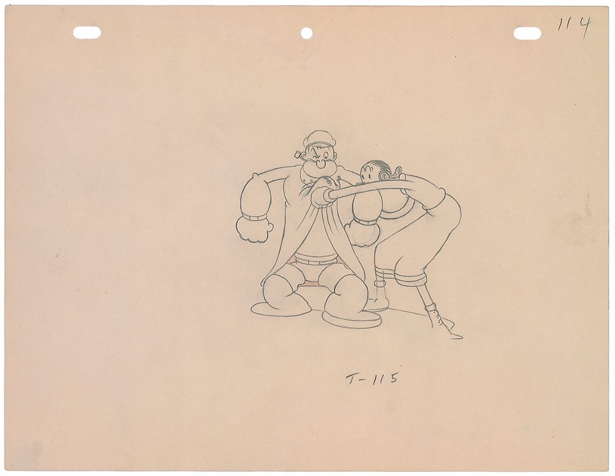 (Fleischer Studios, 1935) Rare original production drawing featuring Popeye and Olive Oyl from Dizzy Divers, showing Olive Oyl attempting to zip down the front of Popeye’s rain coat. Accomplished in graphite and colored pencil on untrimmed 11 x 8.5 animation paper. Image measures 4 x 3.75. In fine condition, with trivial soiling.