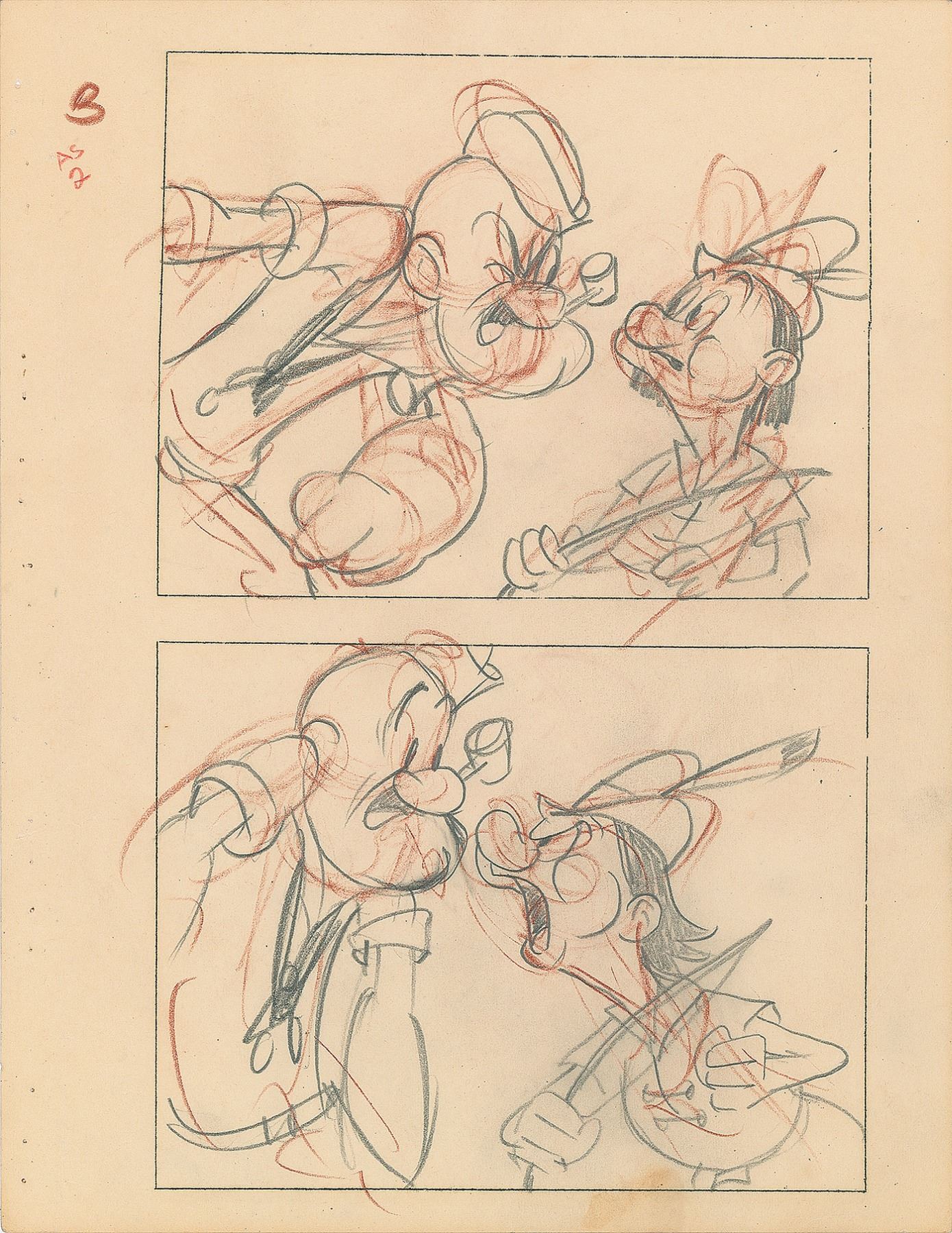 (Fleischer Studios, 1940) Scarce original production storyboard drawings featuring Popeye and William Tell from Popeye Meets William Tell, signed at the bottom of the first page in pencil by longtime Fleischer Studios animator Shamus Culhane. Accomplished in graphite and colored pencil on four sheets of 8.5 x 11 illustration paper, featuring a total of eight panels, each measuring approximately 6.25 x 5. The penultimate panel features the image of Groucho Marx, an interesting addition as Culhane was married to the daughter of Chico Marx. In overall fine condition.