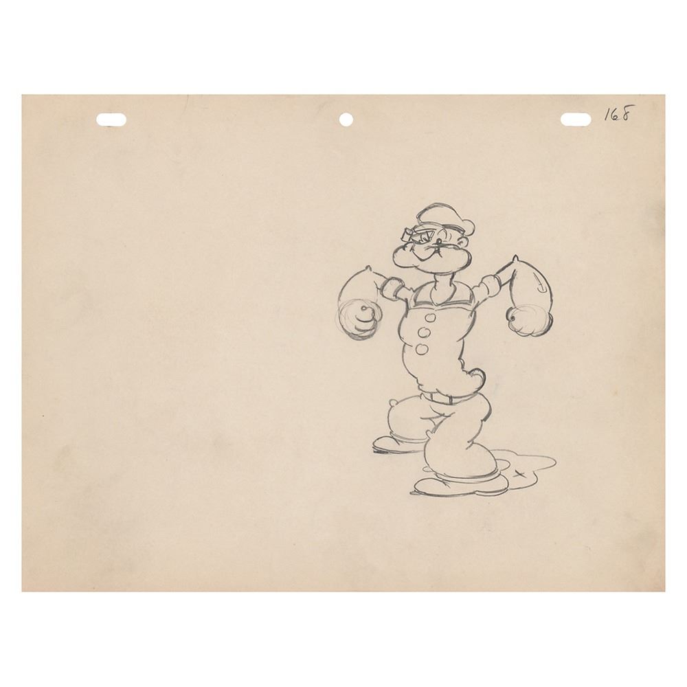(Fleischer Studios, 1934) Original production drawing of Popeye from Sock-a-Bye, Baby, which shows the spinach-loving sailor in a full-length pose. Accomplished in graphite on untrimmed 11 x 8.5 animation paper marked "168" in the upper right corner. Image measures 3.75 x 5. In fine condition.