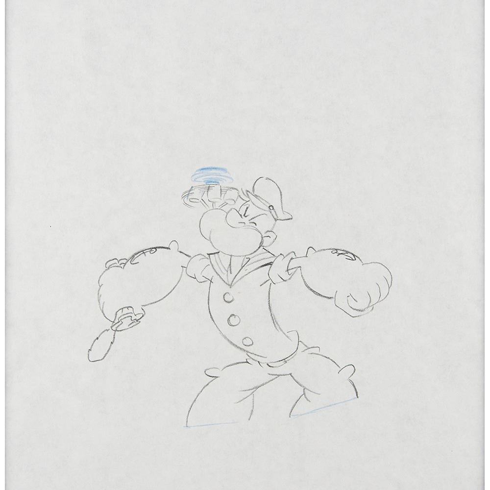 (Jaime Diaz Studios, circa 1984) Original production drawing of Popeye from an unknown Popeye cartoon, which shows the large-armed sailor spinning his pipe just moments after downing a can of spinach. Accomplished in graphite and colored pencil on 12.25 x 11.25 animation paper. Image measures 5.25 x 4, with a mat opening of 8 x 8. Double-matted to an overall size of 13 x 13. In fine condition. Accompanied by a statement of authenticity from Great American Ink.