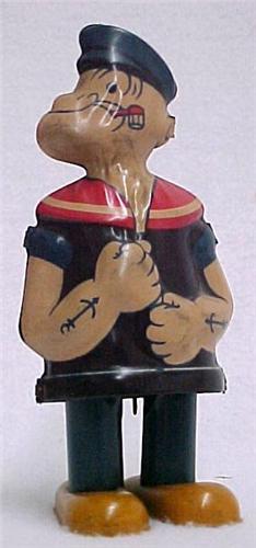 Popeye the Sailor Man; tin wind-up toy; working condition; 6"high; no maker's name ( creases at neck)