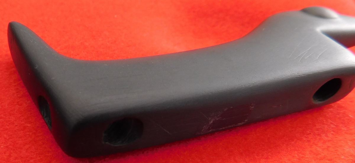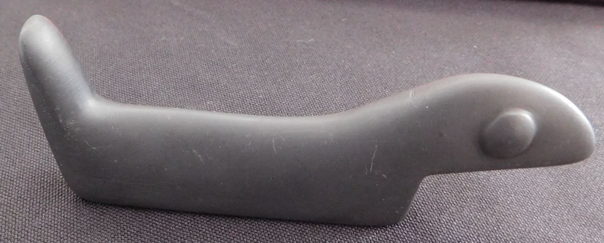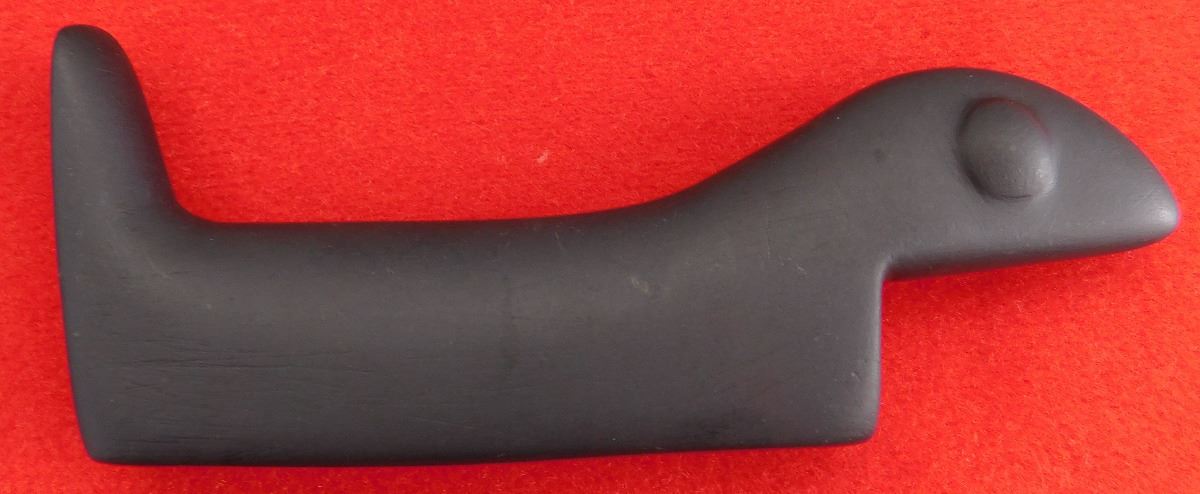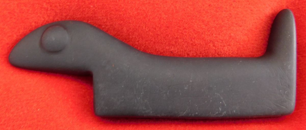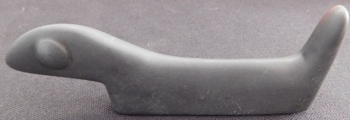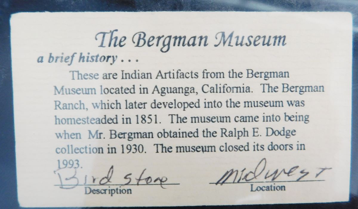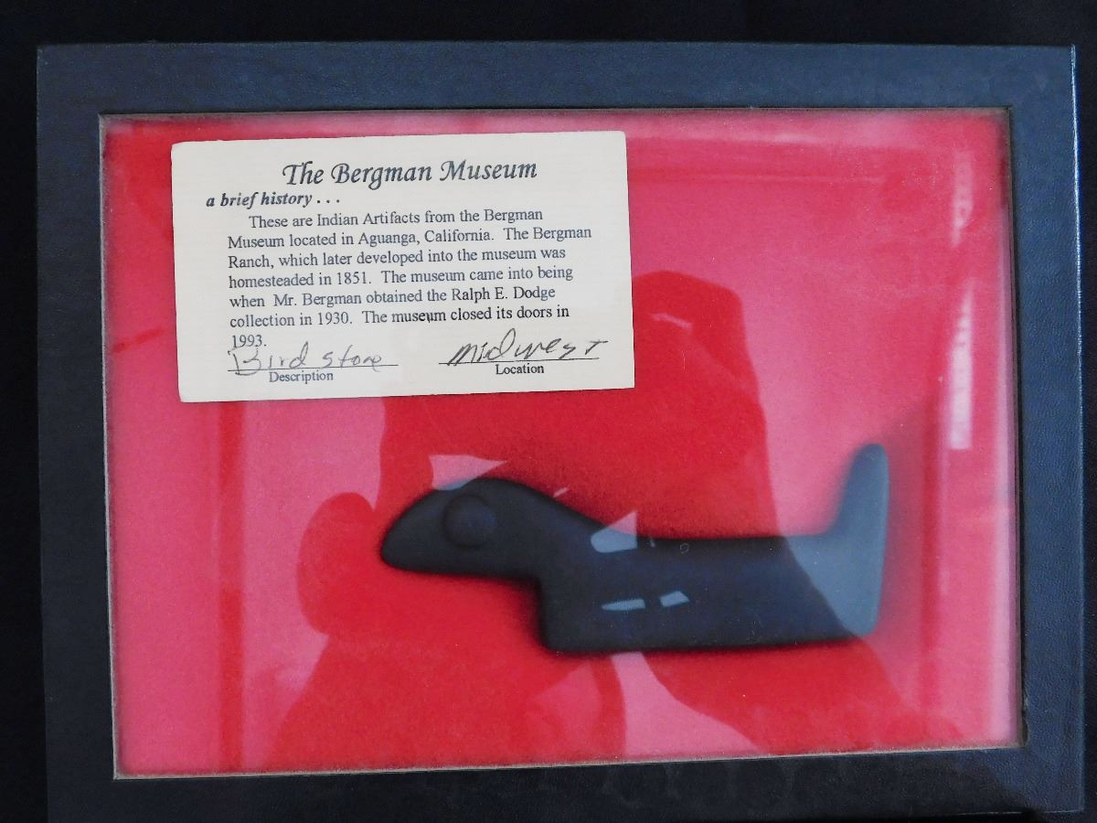 Popeyed Birdstone, pre-historic item. Made of slate, item measures 4" x 1.75" x 0.5". From Illinois, previously at the Bergman Museum. Frame is included. Condition: Very good condition, drilled holes and popeyed, see images. Shipping: $18.50.