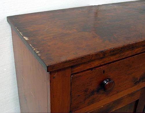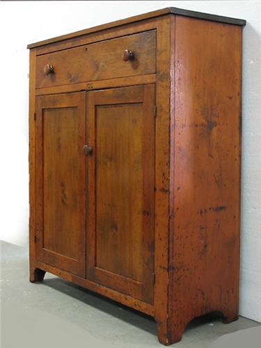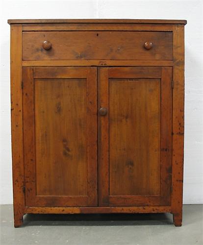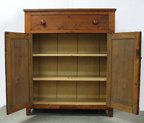 Poplar jelly cupboard; rectangular top over one long drawer; above two doors with recessed panels; bracket feet; mid 19th C.; 4'3" high x 3'7" x 16 1/2" (normal wear)