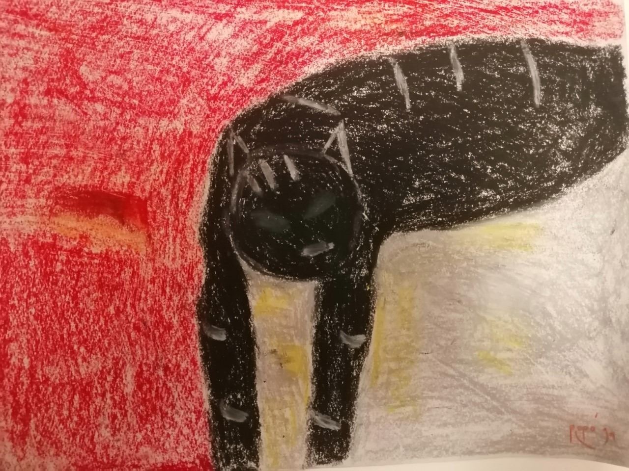 Popo Iskandar’s crayon drawing of a black cat, depicts a mysterious cat figure, black with white stripes. Relying on the effects of spontaneous and transparent stripes, the drawing exemplifies one of many such animal characters that have often become the artist’s most explored objects of exploration.