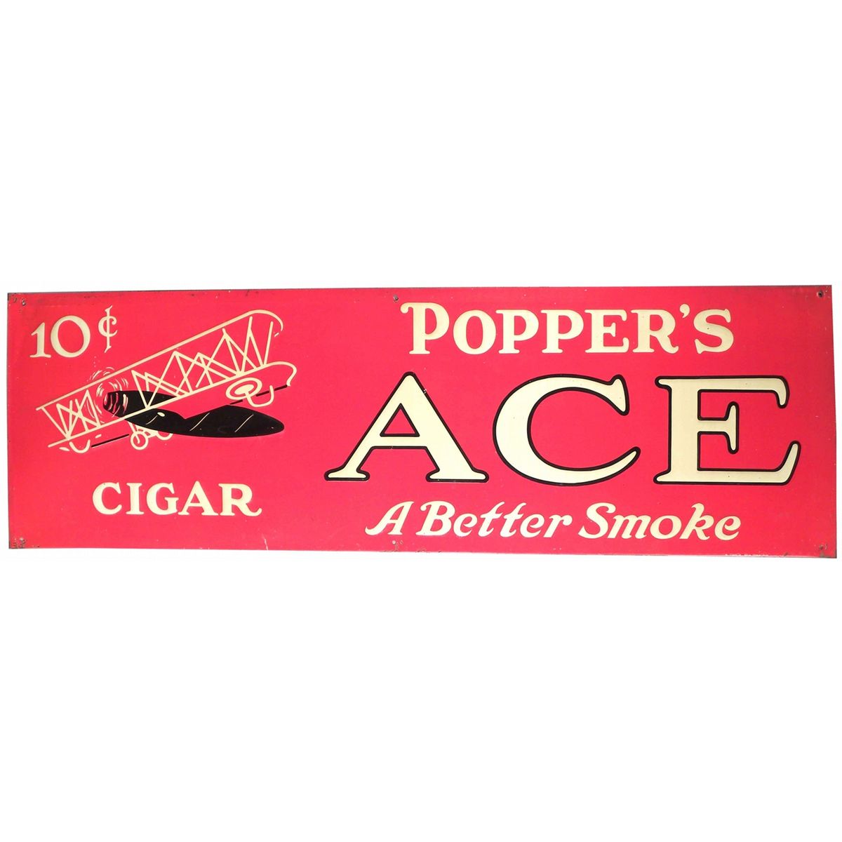 Popper's Ace Cigar Embossed Tin Sign. Light scratches at corners otherwise good condition. 35 X 11 1/4 inches.
