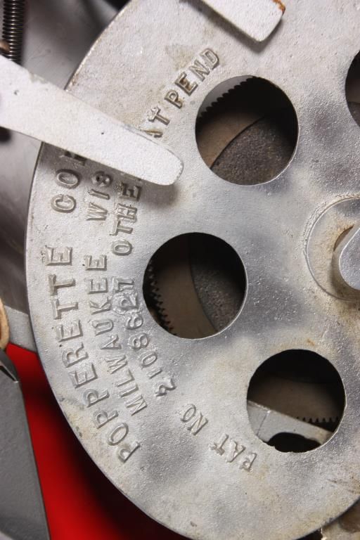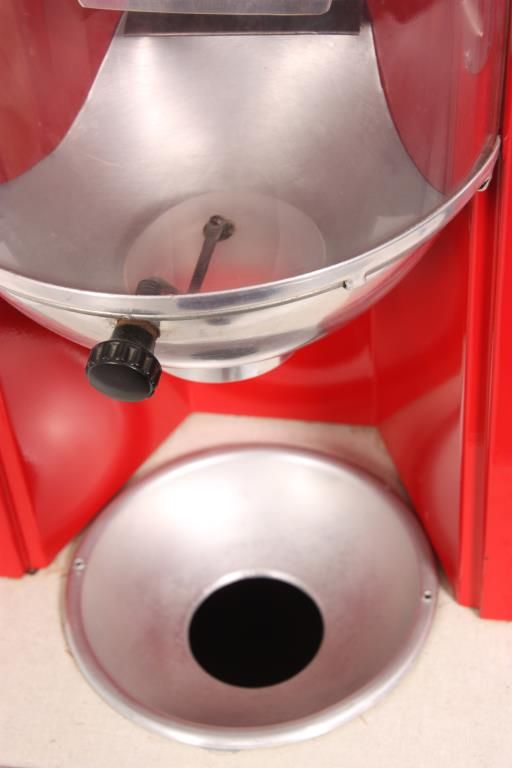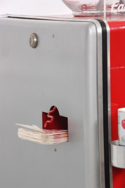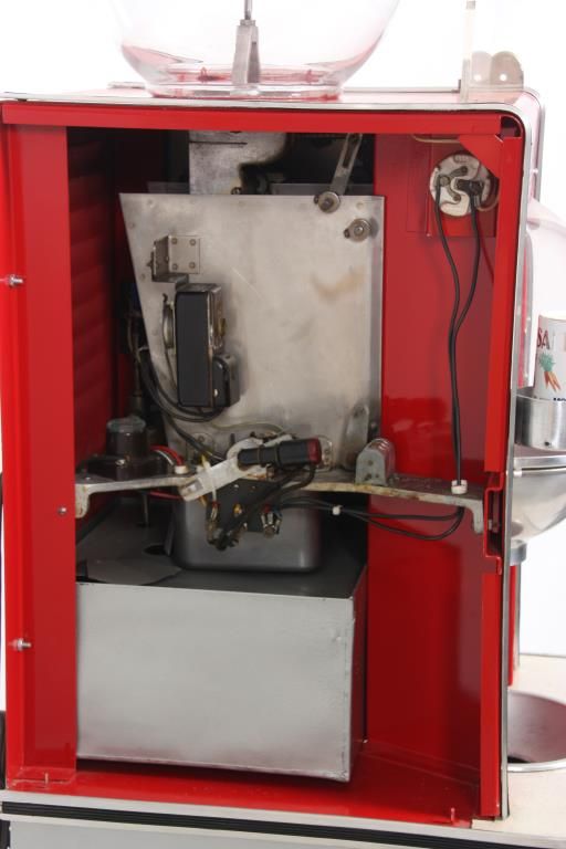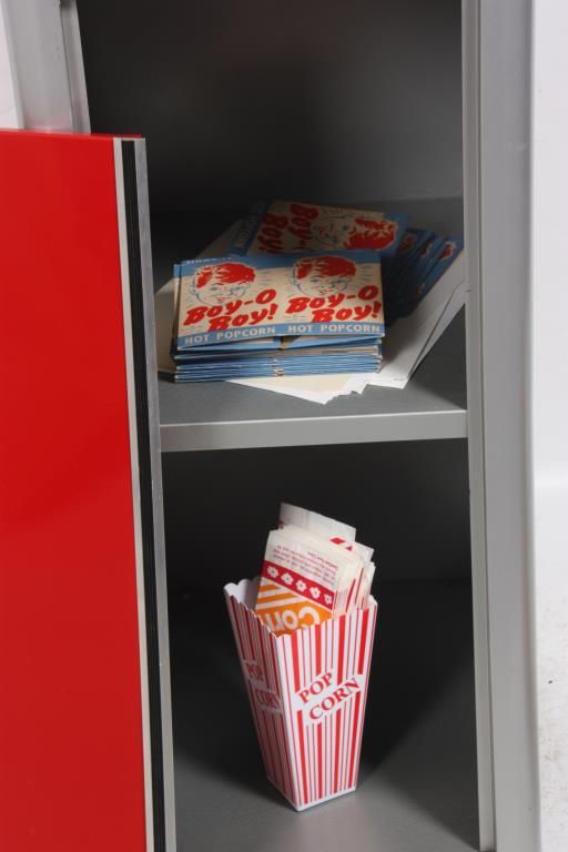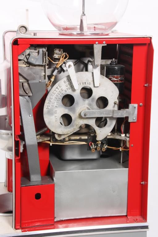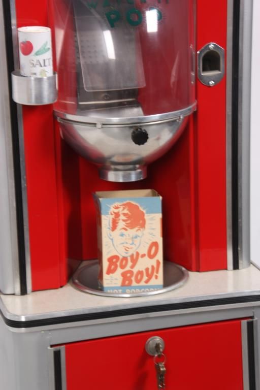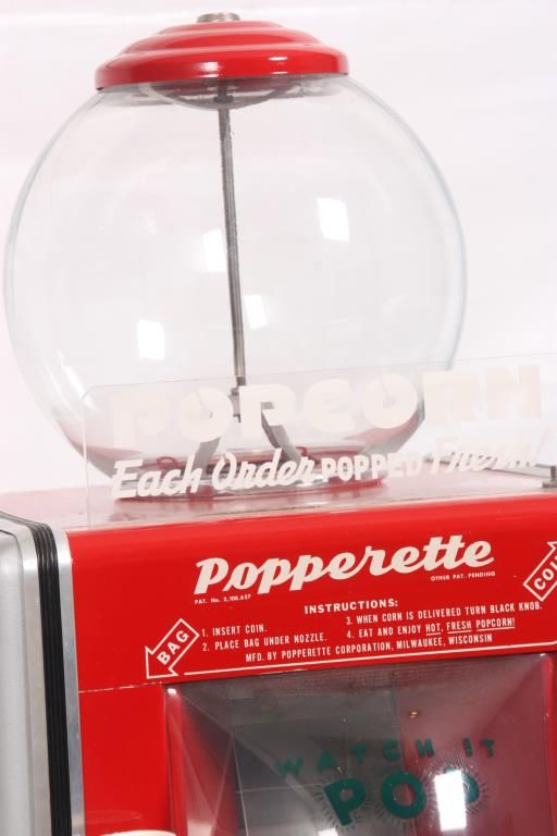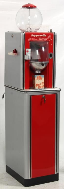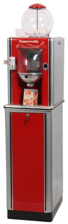 Popperette Coin-op Popcorn Maker & Dispenser. Circa 1950’s popcorn machine, insert coin into the coin slot at the top, the machine dispenses a portion of corn kernels from the glass globe on the top and into the warmer where they are freshly popped and dropped into the catch basin below. On an original 1 door cabinet/stand with silver paint on the sides and red with black highlights on the front. In good working condition. 64 in. high x 15 in. wide x 18.5 in. deep.