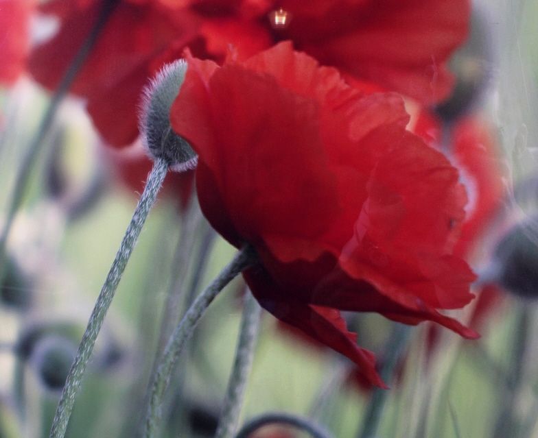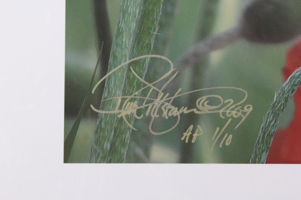 This is an original work of art photographic giclee print that Rein shot in 2009. This original work has a close up study done of bright red and green poppies in a Montana Spring. This is an Artist Proof numbered 1/10. The piece is hand signed and titled by the artist. Rein is a Bozeman, Montana artist whose works hang in many Montana Homes. Slight Crushes on the right that can be cut out for framing print surface is perfect. This is shrink wrapped backed on foam core that measures 33.25"x42 5/8". The artwork measures 28 1/8"x37 5/8"