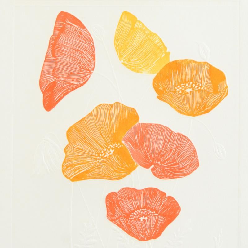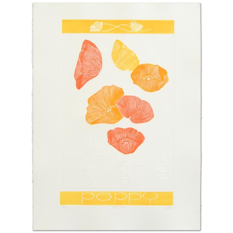 "Poppy" is a limited edition embossed lithograph on paper by Hari Hockey, numbered and hand signed by the artist! Measures approx. 22" x 30" (with border); 14.5" x 24.5" (image).