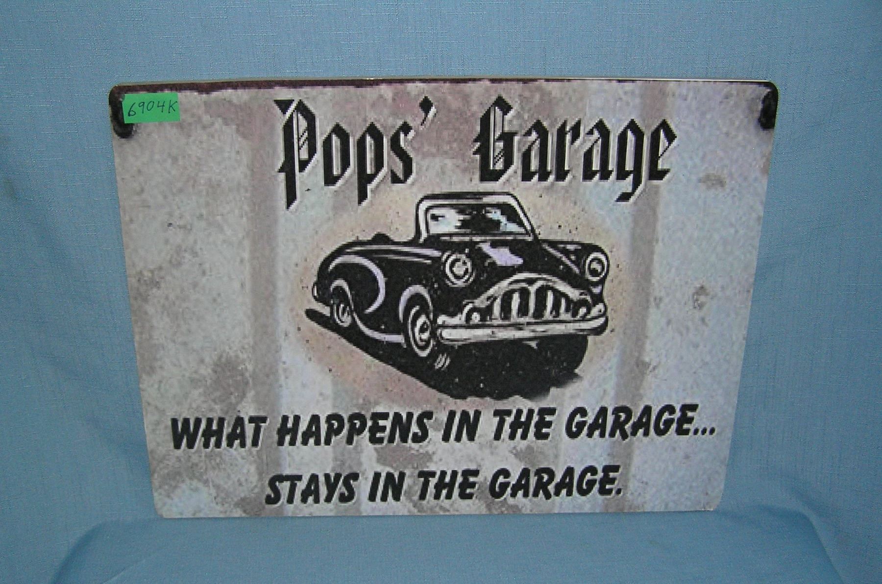 Pops garage what happens in the garage stays in the garage  retro style advertising sign printed on PVC hardboard these signs are auctioned for their decorative and display purposes 12 inches by 16 inches est. value $50.00-$60.00