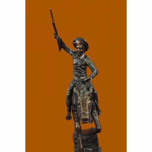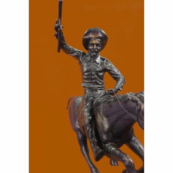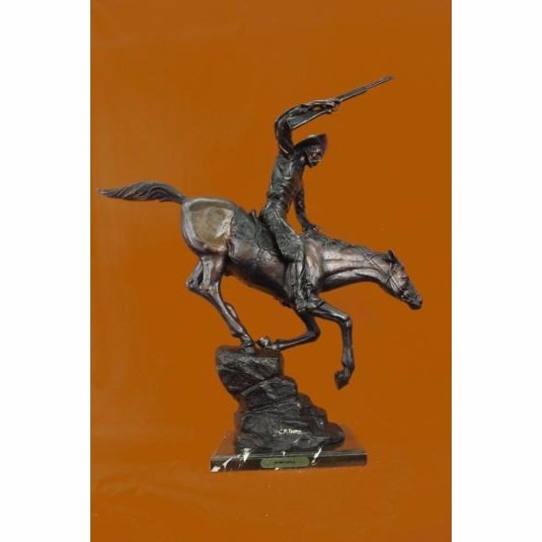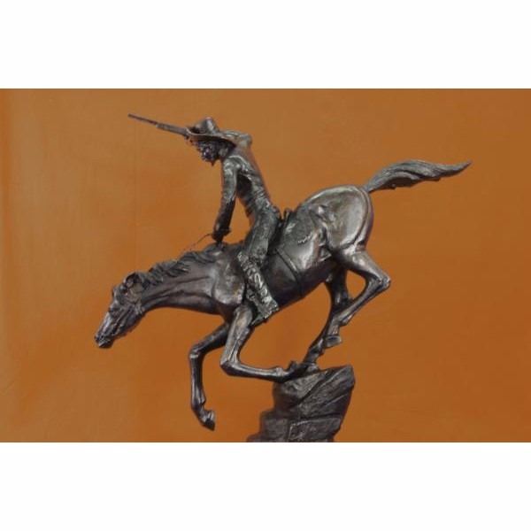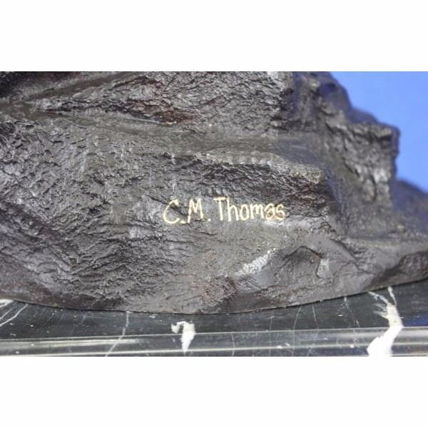 Thomas created Down Hill after switching his casting to Roman Bronze Works. Once Thomas started using the lost wax casting process he realized how easy it was to manipulate each individual wax to his liking making each casting with different characteristics. This sculpture is very appeasing to the eyes giving you dimension, depth and captured movement. This sculpture has so many details that every time you look at it you are sure to find something new. This sculpture was cast using the “Lost Wax Method†and has a gorgeous two tone brown patina. This sculpture is mounted on a black marble base and is signed C.M. Thomas. Condition :This sculpture is in a perfect condition. Bronze Dimensions with Marble Base:Height 26" x Width 27" Marble Dimensions: 12" x 8" Height without base: 25" Weight : 35 LBS Inventory 15-5851817351