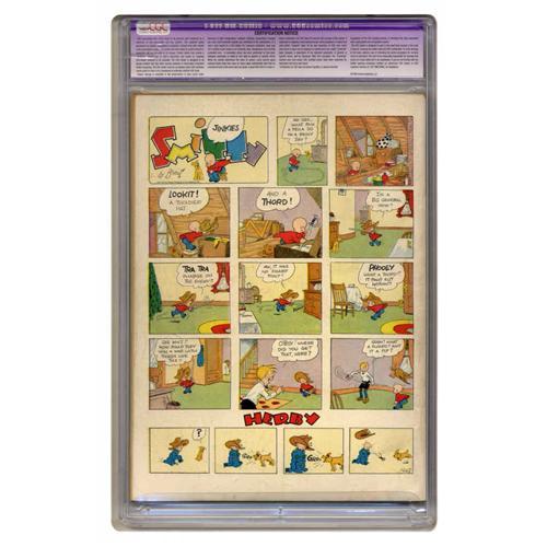 <B>Popular Comics #1 (Dell, 1936) CGC Apparent VF- 7.5 Slight (P) Cream to off-white pages.</B></I> The first comic book appearance of Dick Tracy is also nothing less than the first-ever Dell comic book! That's momentous considering that Dell is probably the bestselling comic publisher of all time. And Dell was only the third publisher to enter the comic book market (after Eastern Color and DC). This is also the first comic book appearance of radio character Don Winslow of the Navy, who would go on to star in his own comic series at Fawcett in years to come. The rest of the book is a virtual Who's Who of 1930s comicdom: there's Little Orphan Annie, Gasoline Alley, Harold Teen, Terry and the Pirates, and Mutt and Jeff, and those are just the biggest names on a roster too long to list in its entirety (and check out an unusually lighthearted moment for Tracy, as he shares the cover with some jokesters from the funny pages). This book is rated "scarce" by Gerber's <B>Photo-Journal</B></I>. For a comic from the Platinum Age, this is an astoundingly nice copy. Yes, some professional restoration has helped with its immaculate appearance, but there don't seem to be high-grade unrestored copies around -- the nicest blue-label copy to cross CGC's desk to date is a modest VG-, so this might well hold the title of most attractive available copy. CGC notes, "Restoration includes: small amount of color touch, cover reinforced, staples cleaned." Overstreet 2005 GD 2.0 value = $675; VG 4.0 value = $1,350; FN 6.0 value = $2,025; VF 8.0 value = $4,800.