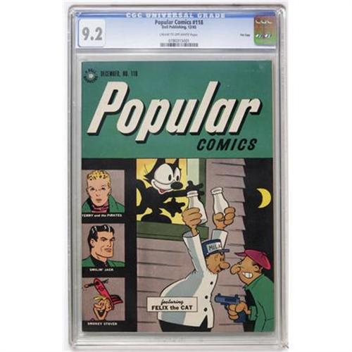 <B>Popular Comics #118 File Copy (Dell, 1945) CGC NM- 9.2 Cream to off-white pages.</B></I> Features Felix the Cat, Terry and the Pirates, Smilin' Jack, and Smokey Stover. Overstreet 2007 NM- 9.2 value = $130. CGC census 10/07: 1 in 9.2, none higher.<BR><BR><b>Shipping:</b> Comics - Slabbed (certified) (<a target="_blank" href="http://www.heritageauctions.com/common/shipping.php">view shipping information</a>)