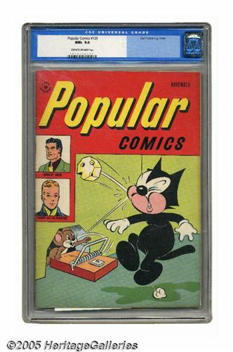 <B>Popular Comics #129 (Dell, 1946) CGC NM+ 9.6 Cream to off-white pages.</B></I> Here's an unbelievable copy of this issue of Dell's first title. Features include Smilin' Jack, Terry and the Pirates, Smokey Stover, and Felix the Cat. It ranks as the highest-graded of the mere two copies of this issue yet certified by CGC. Overstreet 2005 NM- 9.2 value = $125. CGC census 5/05: 1 in 9.6, none higher.