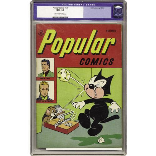 <B>Popular Comics #129 (Dell, 1946) CGC NM+ 9.6 Cream to off-white pages.</B></I> Here's an unbelievable copy of this issue of Dell's first title. Features include Smilin' Jack, Terry and the Pirates, Smokey Stover, and Felix the Cat. It ranks as the highest-graded of the mere two copies of this issue certified by CGC to date. Overstreet 2006 NM- 9.2 value = $125. CGC census 3/06: 1 in 9.6, none higher.