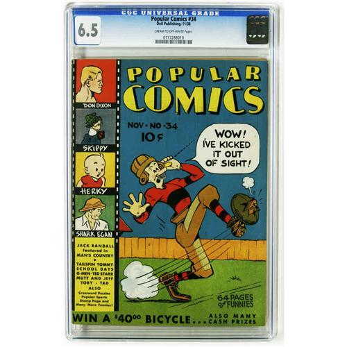 <B>Popular Comics #34 (Dell, 1938) CGC FN+ 6.5 Cream to off-white pages.</B></I> Characters include Mutt and Jeff and Tailspin Tommy. Overstreet 2005 FN 6.0 value = $144; VF 8.0 value = $276. CGC census 12/05: 1 in 6.5, none higher.