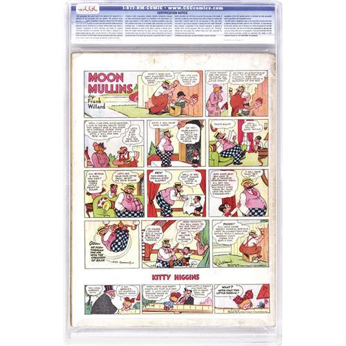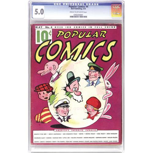 <B>Popular Comics #4 (Dell, 1936) CGC VG/FN 5.0 Cream to off-white pages.</B></I> This early issue of Dell's first series may not exist in high grade - Overstreet doesn't list a value above VF for this issue, and no copy has been graded higher than this one by CGC. As was the case for most of this title's run, Dick Tracy, Little Orphan Annie, and Terry and the Pirates are the headliners. Overstreet 2006 VG 4.0 value = $280; FN 6.0 value = $420. CGC census 6/06: 1 in 5.0, none higher. <BR><BR><B>Important notice:</B> Heritage usually auctions material at the rate of 200-250 lots per hour. On some occasions eBay Live bid software or the Internet may not be able to keep up with the pace of the auction. We recommend placing a realistic absentee bid now as insurance to avoid disappointment. Occasionally the auctioneer may eliminate or reject an eBay Live bid, and the auctioneer may also reopen a lot after the close of the eBay live bidding (usually because we missed an audience bid), and may reject your bid even if it shows you as the winning bidder. By bidding via eBay Live, you agree that Heritage may award the lot to another bidder at its sole discretion under the circumstances described above or any other reasonable circumstances. Since eBay bids are not shown to us until we open the lot on the floor, we treat those bids just like floor bids. In most cases the floor responds before the eBay bid is presented to us, due to Internet lag time, so for consistency we have made it a policy that floor bids are always considered first over tie eBay live bids. Also please note that all Heritage lots purchased through eBay Live carry a 22.5% Buyer's Premium. Please make sure you read the Terms and Conditions before you bid. This lot is being auctioned in conjunction with a live floor auction by Heritage Auction Galleries. All final auction and invoice information will be supplied by Heritage Auction Galleries, and all other information should be considered preliminary. Lot:41001 <BR><BR><B>Winning Notification and Billing:</B> After the FINAL session in this auction is complete, Heritage will send e-mail and snail mail invoices. This process normally takes several days. All final auction and invoice information will be supplied by Heritage Auction Galleries, and all other information should be considered preliminary. <BR><BR>This auction will be conducted on a live auction floor and over the Internet through eBay Live. If you choose to place an absentee bid, please take a moment to <font color='#0000ff'><u><a href='http://pages.ebay.com/liveauctions/help/before/laabsentee.html'>learn how eBay Live absentee bidding works</a></u></font><font color='#000000'>