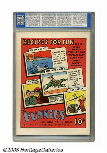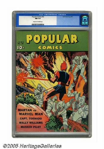 <B>Popular Comics #52 (Dell, 1940) CGC NM 9.4 Cream to off-white pages.</B></I> This issue is billed by Overstreet as having a "robot cover." While the menaces here may be more man than machine, our eyes are drawn to the colors of the fiery action around them, which have withstood the passing of time without losing their brilliance. <B>Popular</B></I> though these comics may have been, that doesn't make them easy to find in top grades today; NM is the highest grade that CGC has assigned for #52 to date, with only the revered Mile High copy equaling this one. Overstreet 2005 NM- 9.2 value = $375. CGC census 4/05: 2 in 9.4, none higher.