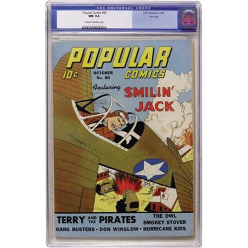 <B>Popular Comics #80 File Copy (Dell, 1942) CGC NM 9.4 Cream to off-white pages.</B></I> Smilin' Jack and the Owl are featured. Overstreet 2007 NM- 9.2 value = $320. CGC census 6/07: 2 in 9.4, none higher.<BR><BR><b>Shipping:</b> Comics - Slabbed (certified) (<a target="_blank" href="http://www.heritageauctions.com/common/shipping.php">view shipping information</a>)
