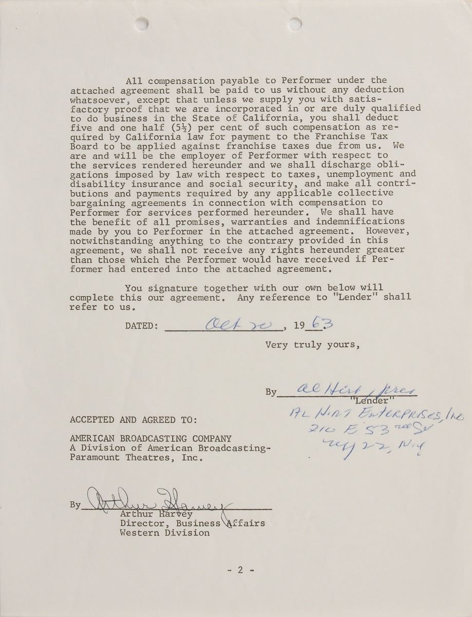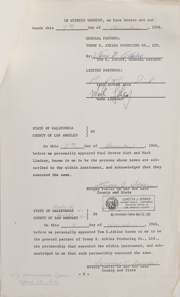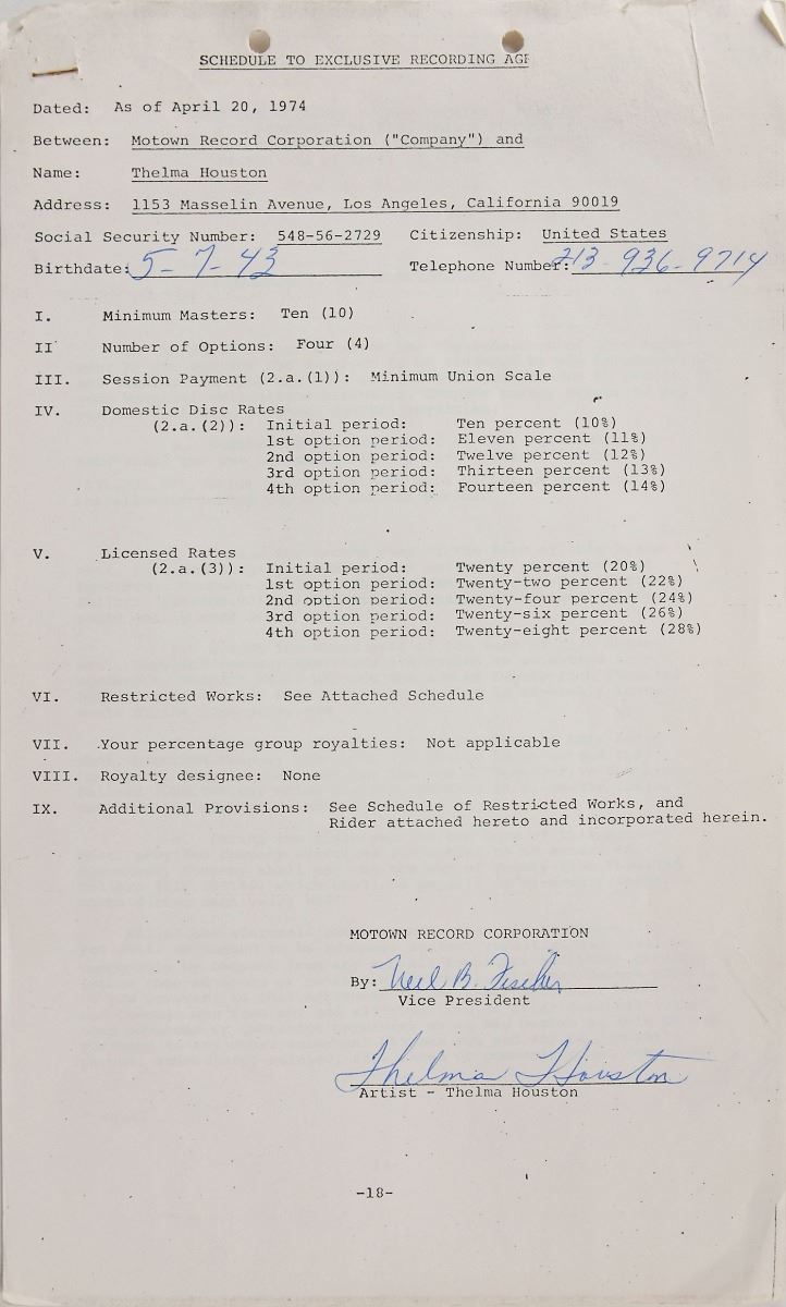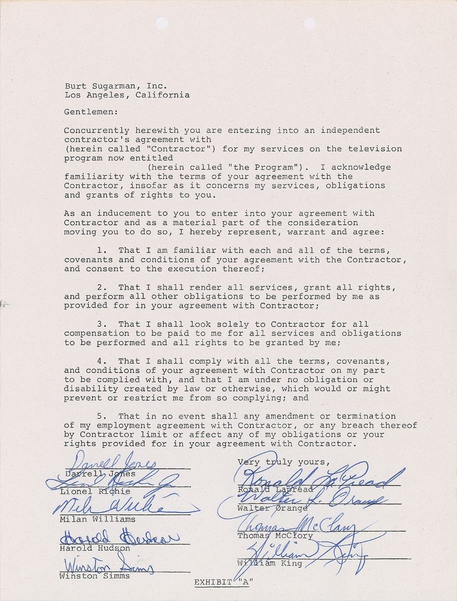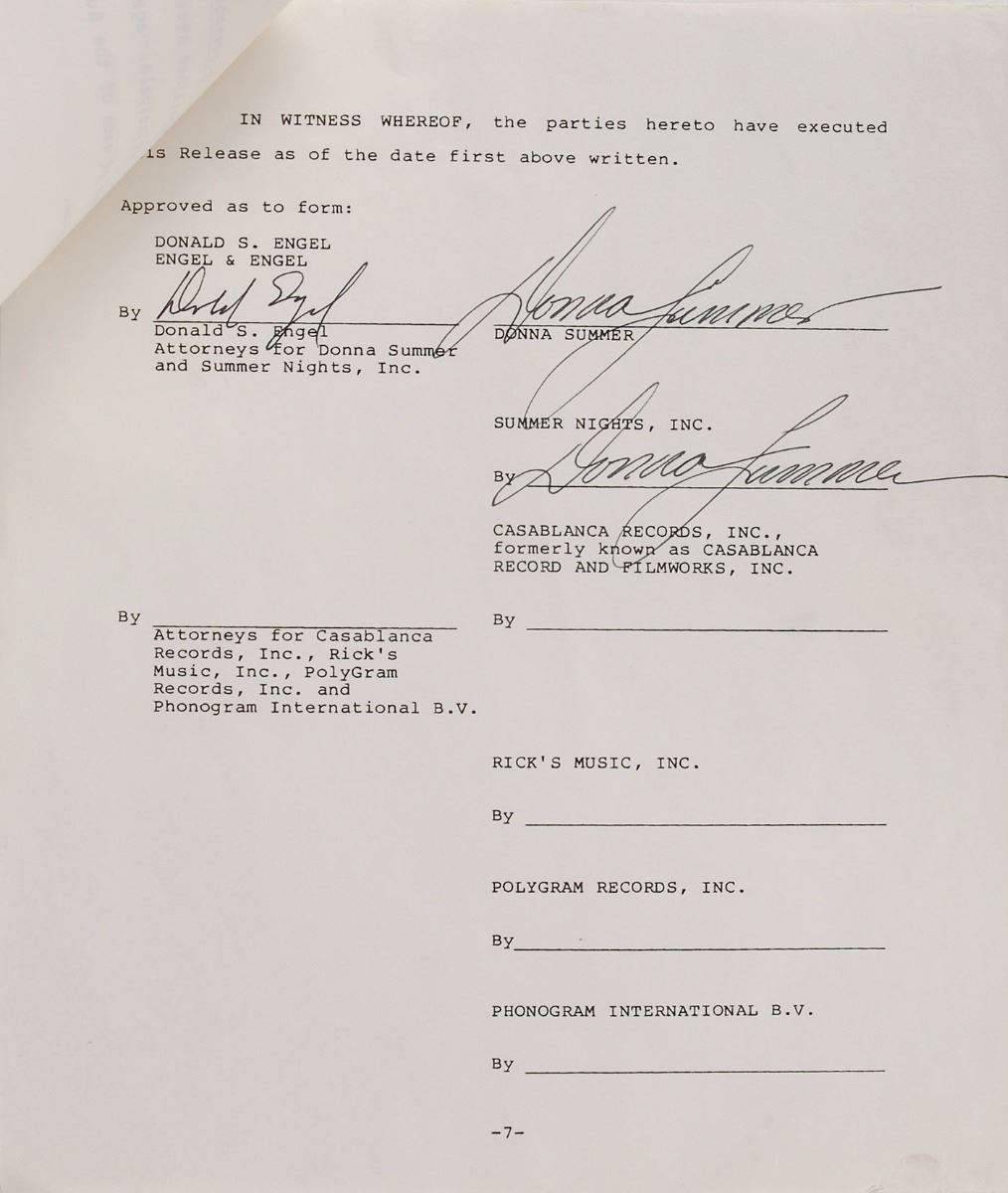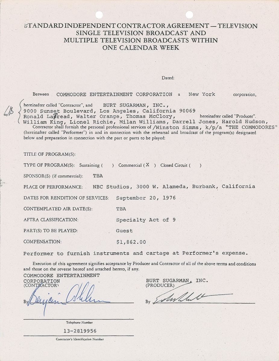 Collection of eight documents signed by popular bands and musicians, including: Donna Summer, Thelma Houston, Paul Revere and Mark Lindsay, Al Hirt, Menudo, The Commodores, The Platters, and Average White Band. In overall very good to fine condition.