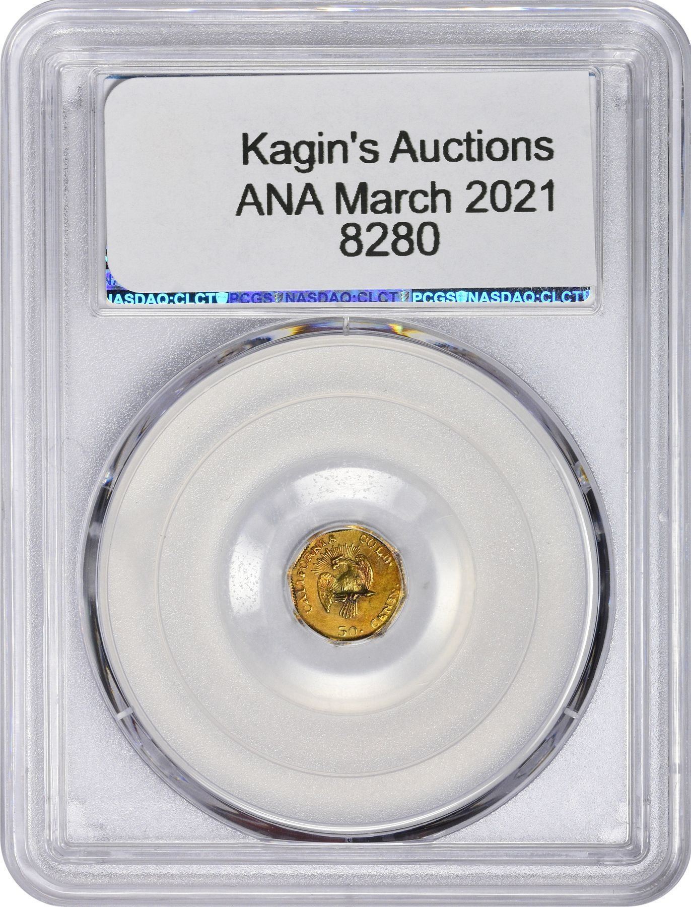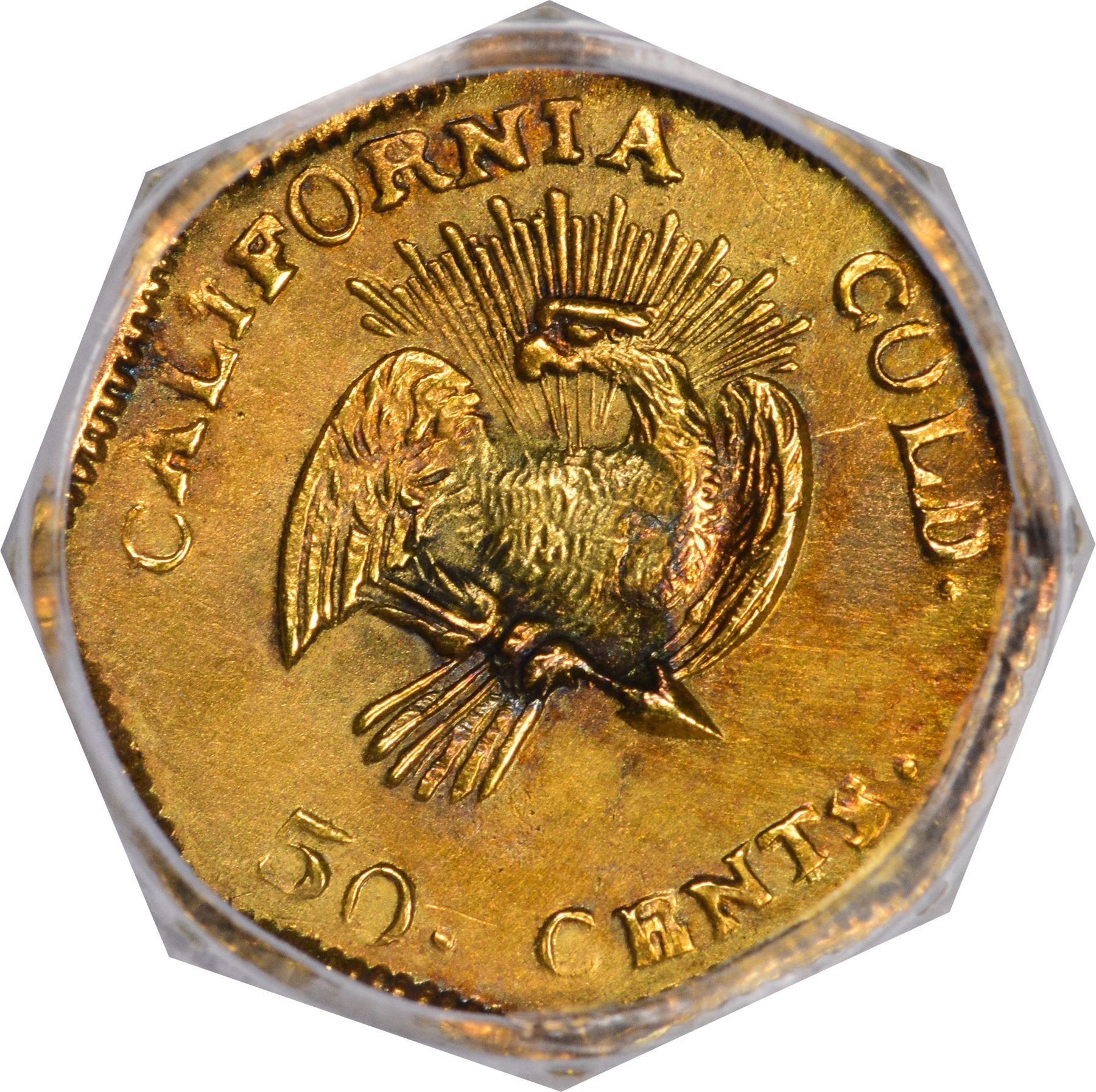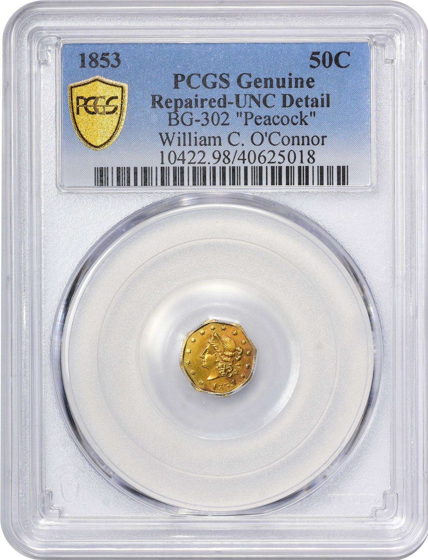 Description: 1853 F.D. octagonal 50 Cents, BG-302, Die State I (perfect dies, clear repunching on 50 and T), Eagle With Rays (so-called “Peacock”) reverse, PCGS Genuine, Repaired - UNC Detail. Known to have been issued in the year dated: three were recovered from the wreck of the S.S. Winfield Scott, which sailed December 1, 1853. Same head, 13 stars around, F.D. behind, but Frontier & Deviercy replaced the Humbert style eagle with one adapted from the new 1853 Arrows and Rays half dollars (perhaps thinking that this design change was permanent), 50.CENTS below. Very popular type; nicknamed “peacock” by Kagin’s founder A.M. Kagin many years ago because of the resemblance of the rays to tail feathers. Bright gold color, edge filed? PCGS Genuine Repaired - UNC Detail "Peacock" William C. O’Connor (PCGS# 10422).