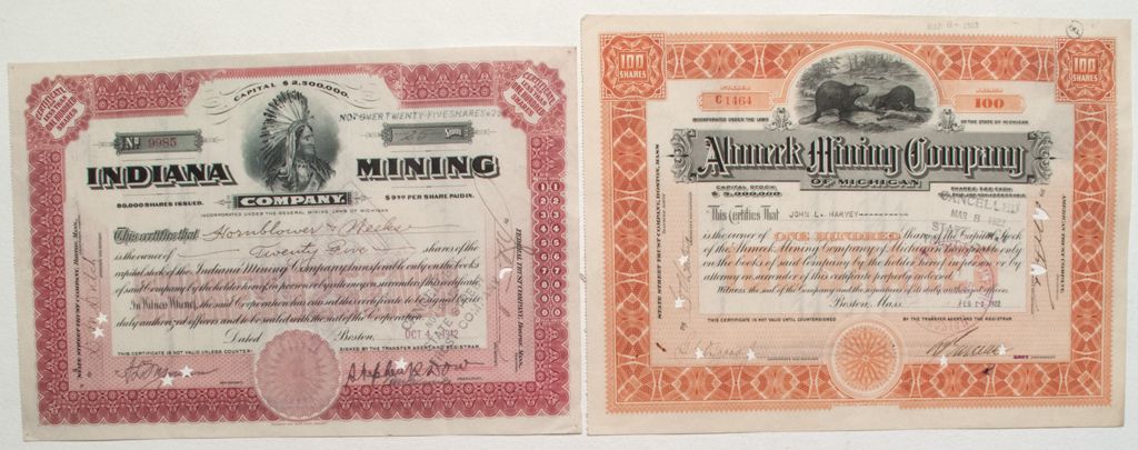 These two stocks are popular for their nice vignettes. 1) Ahmeekk Mining Company has two beavers busy at work. The Ahmeek Mines were worked from 1880 to 1923. 2) Indiana Mining Company has an Indian Chief. The Indiana Mining Company was late starter incorporating in 1909. The mine was worked until 1923. Hornblower and Meeks purchased this stock one year before it closed. I am thinking it wasn't a great investment!City: County: State: MI