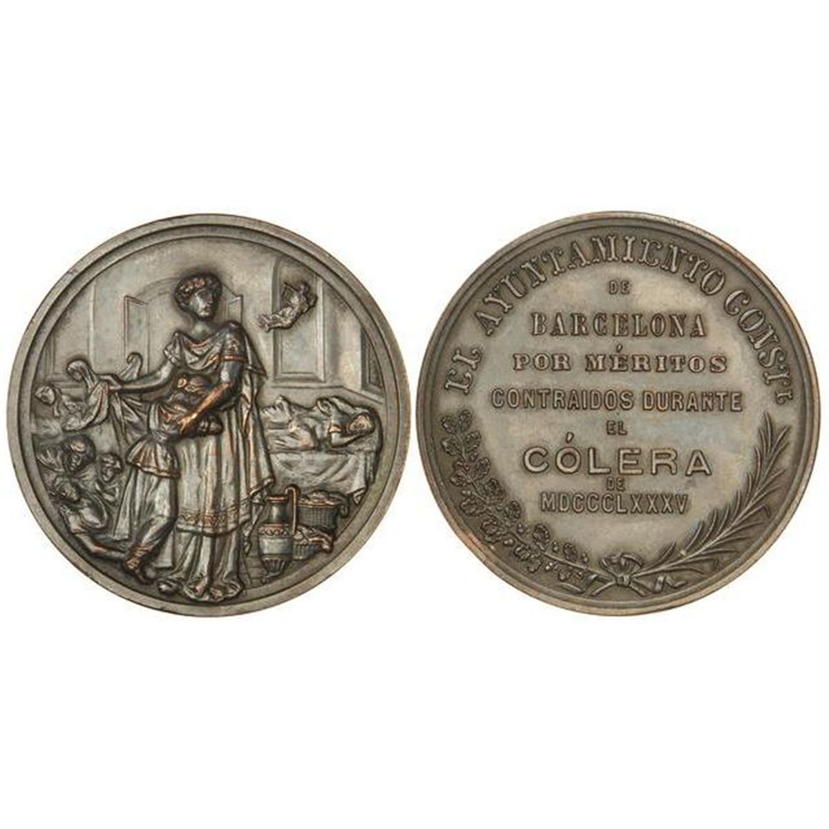 Por méritos Contraidos Durante el Cólera. - 1885. - EL AYUNTAMIENTO CONST. DE BARCELONA. - Anv.: Matrona cuidando enfermos. Rev.: Leyenda y laurea. AE. Ø 53 mm. En estuche algo deteriorado. EBC+. - -