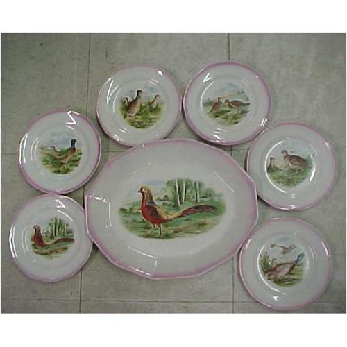 Porcelain 7-Piece Sebring Platter/Plates. White with pink with wild bird motiff. One platter, six plates (hand painted), signed Daudin. Sebring, Ohio, S.P. Co., S-V, B24. All different birds. Two plates with small nicks, crazing underside. Some discoloration; large platter has nick in edge. Buyer pays shipping and handling costs.